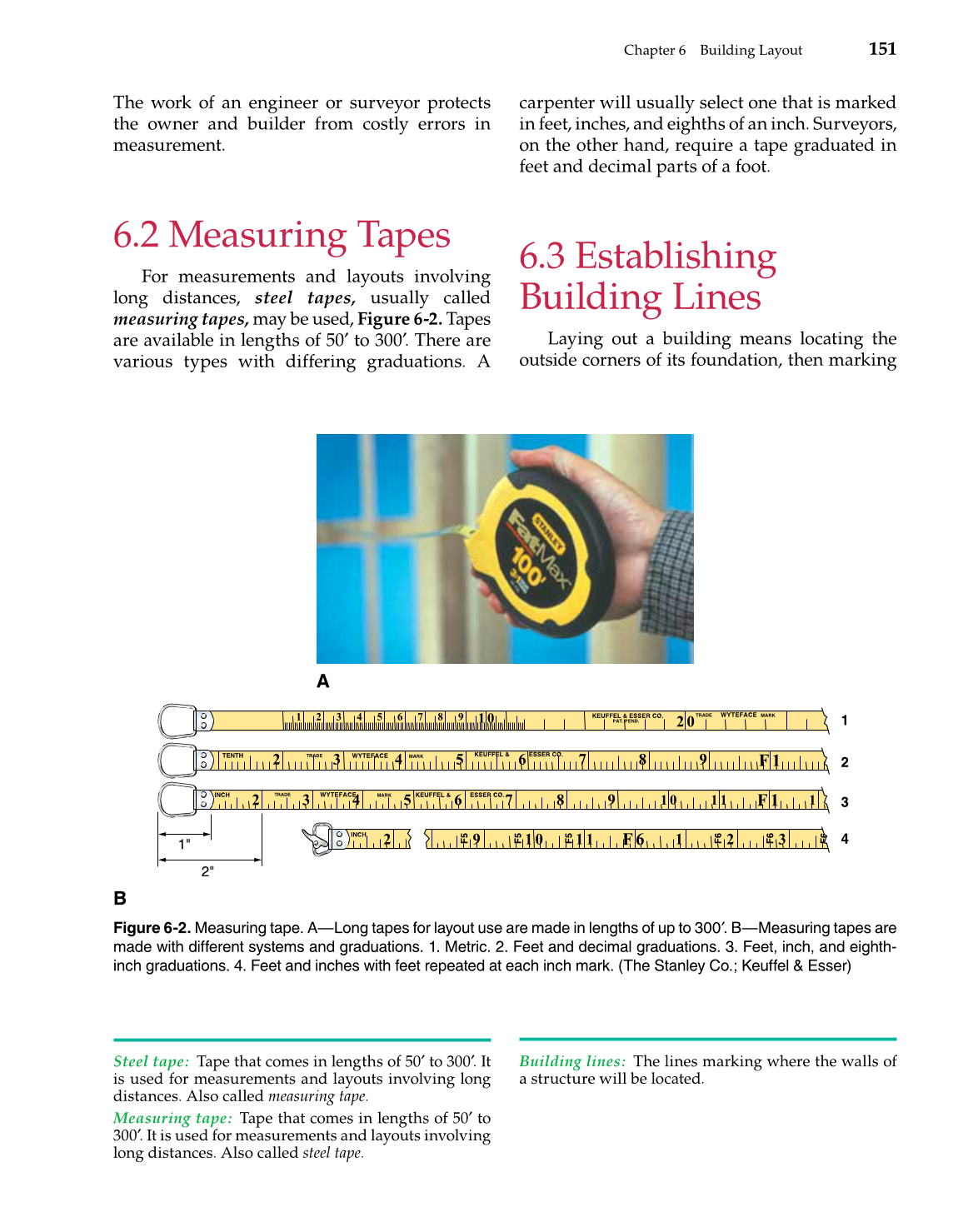 Figure 6-2. Measuring tape. A—Long tapes for layout use are made in lengths of up to 300′. B—Measuring tapes are