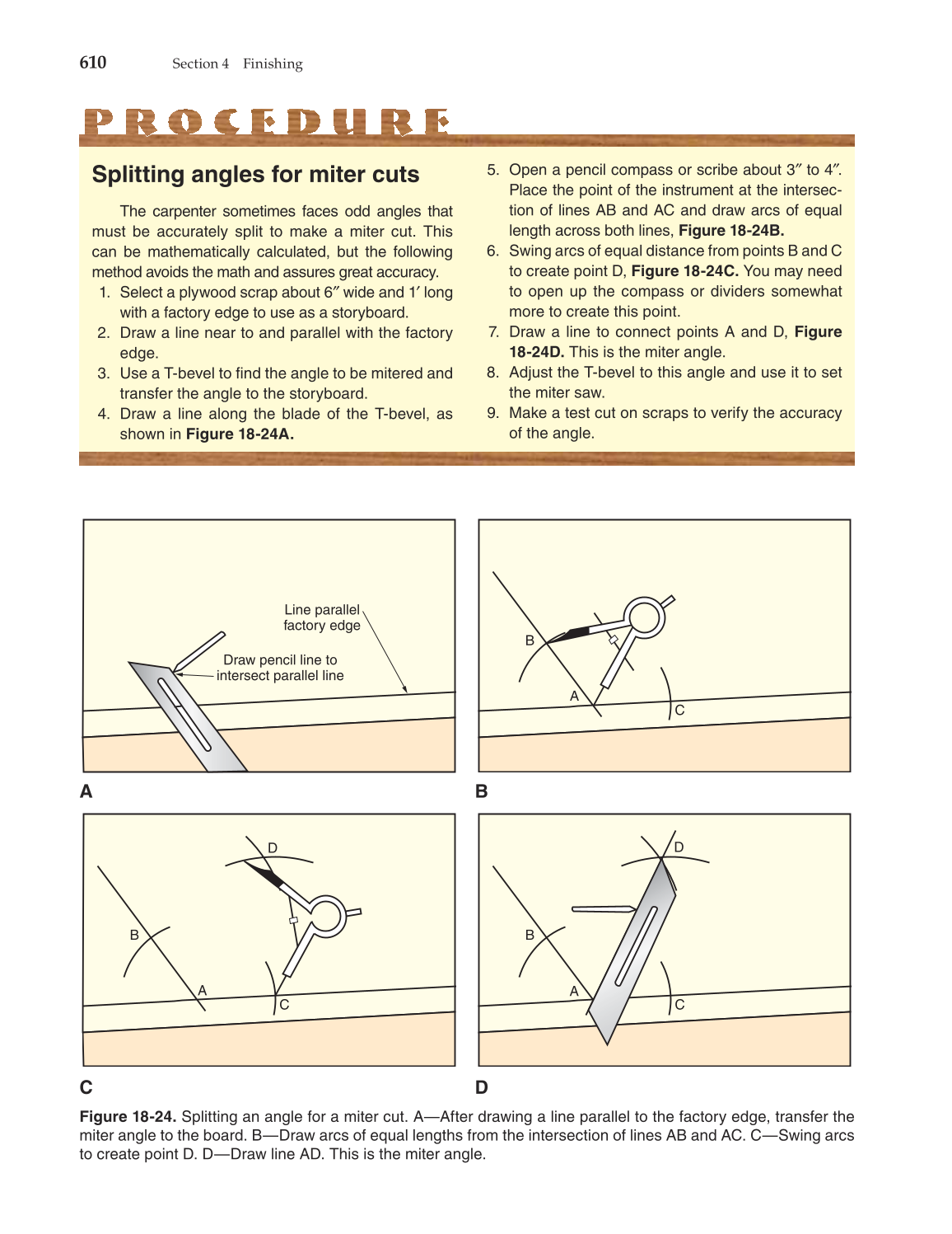 Figure 18-24. Splitting an angle for a miter cut. A—After drawing a line parallel to the factory edge, transfer the