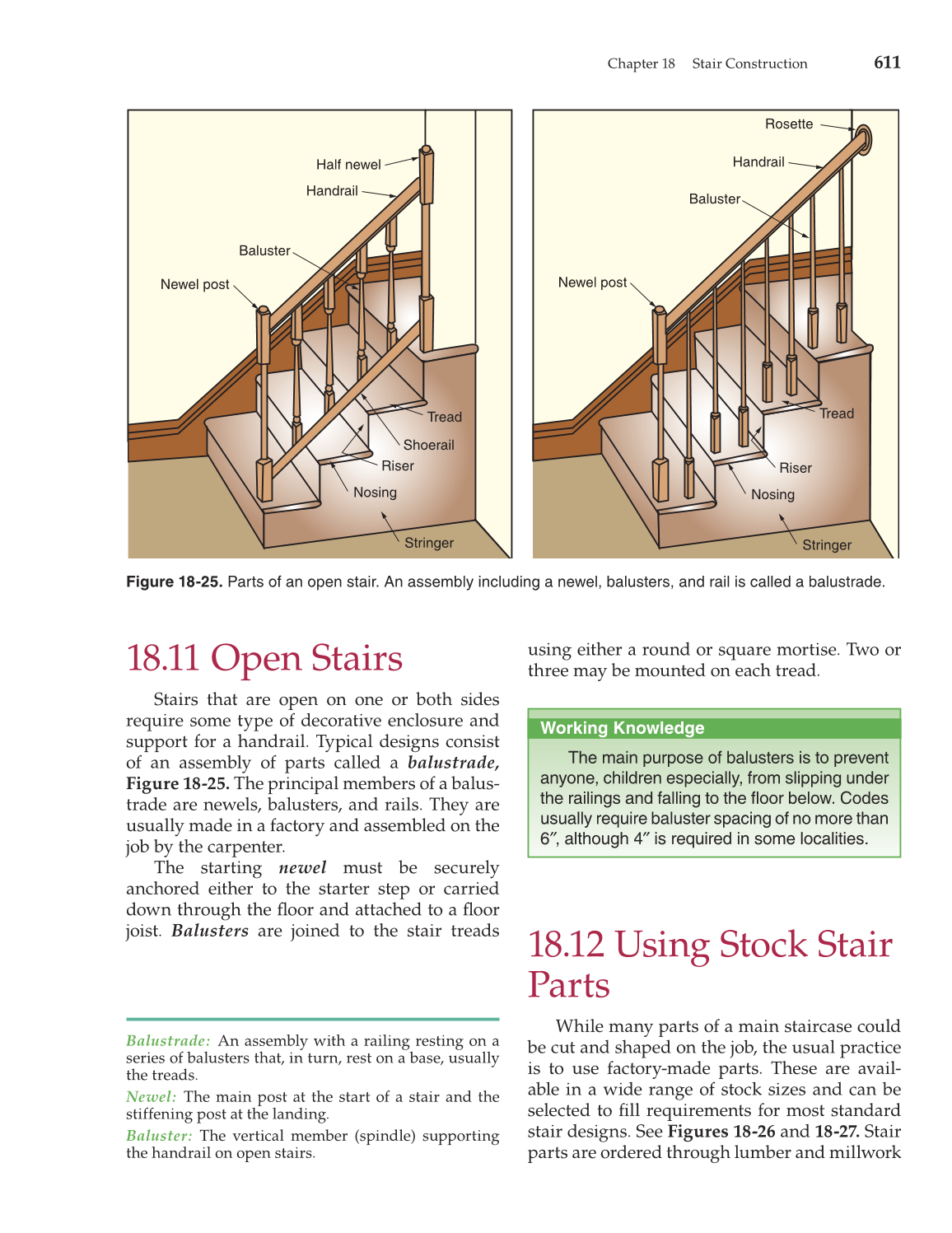 Figure 18-25. Parts of an open stair. An assembly including a newel, balusters, and rail is called a balustrade.