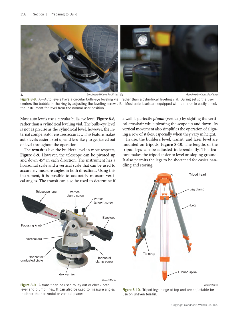 Figure 8-8. A—Auto levels have a circular bulls-eye leveling vial, rather than a cylindrical leveling vial. During setup the user