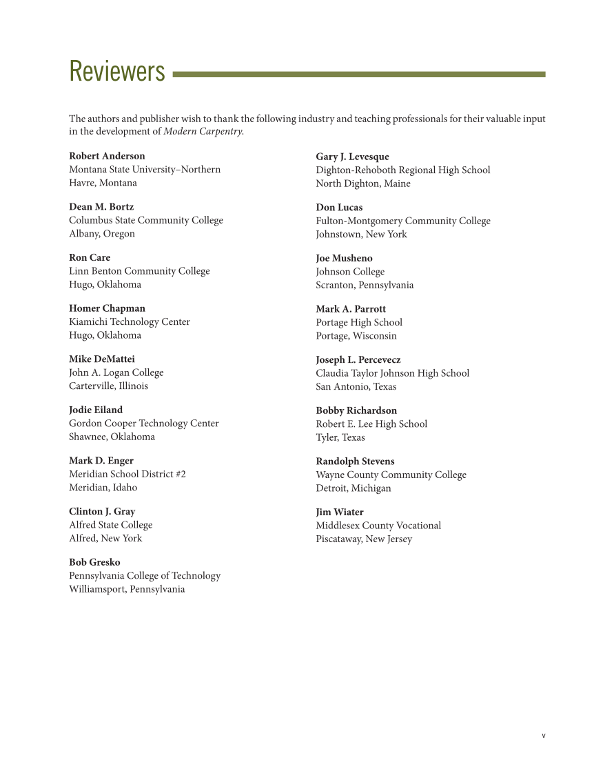 The authors and publisher wish to thank the following industry and teaching professionals for their valuable input