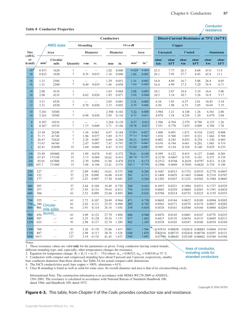 Chapter 6 Conductors 87 Copyright Goodheart-Willcox Co., Inc. 18 18 16 16 14 14 12 12 10 10 8 8 6 4 3 2 1 1/0 2/0 3/0 4/0 250 300 350 400 500 600 700 750 800 900 1000 1250 1500 1750 2000 1 7 1 7 1 7 1 7 1 7 1 7 7 7 7 7 19 19 19 19 19 37 37 37 37 37 61 61 61 61 61 61 91 91 127 127 — 0.39 — 0.49 — 0.62 — 0.78 — 0.98 — 1.23 1.56 1.96 2.20 2.47 1.69 1.89 2.13 2.39 2.68 2.09 2.29 2.47 2.64 2.95 2.52 2.72 2.82 2.91 3.09 3.25 2.98 3.26 2.98 3.19 1.02 1.16 1.29 1.46 1.63 1.85 2.05 2.32 2.588 2.95 3.264 3.71 4.67 5.89 6.60 7.42 8.43 9.45 10.62 11.94 13.41 14.61 16.00 17.30 18.49 20.65 22.68 24.49 25.35 26.16 27.79 29.26 32.74 35.86 38.76 41.45 0.040 0.046 0.051 0.058 0.064 0.073 0.081 0.092 0.102 0.116 0.128 0.146 0.184 0.232 0.260 0.292 0.332 0.372 0.418 0.470 0.528 0.575 0.630 0.681 0.728 0.813 0.893 0.964 0.998 1.030 1.094 1.152 1.289 1.412 1.526 1.632 0.001 0.002 0.002 0.003 0.003 0.004 0.005 0.006 0.008 0.011 0.013 0.017 0.027 0.042 0.053 0.067 0.087 0.109 0.137 0.173 0.219 0.260 0.312 0.364 0.416 0.519 0.626 0.730 0.782 0.834 0.940 1.042 1.305 1.566 1.829 2.092 7.77 7.95 4.89 4.99 3.07 3.14 1.93 1.98 1.21 1.24 0.764 0.778 0.491 0.308 0.245 0.194 0.154 0.122 0.0967 0.0766 0.0608 0.0515 0.0429 0.0367 0.0321 0.0258 0.0214 0.0184 0.0171 0.0161 0.0143 0.0129 0.0103 0.00858 0.00735 0.00643 8.08 8.45 5.08 5.29 3.19 3.26 2.01 2.05 1.26 1.29 0.786 0.809 0.510 0.321 0.254 0.201 0.160 0.127 0.101 0.0797 0.0626 0.0535 0.0446 0.0382 0.0331 0.0265 0.0223 0.0189 0.0176 0.0166 0.0147 0.0132 0.0106 0.00883 0.00756 0.00662 42.0 42.8 26.4 26.9 16.6 16.9 10.45 10.69 6.561 6.679 4.125 4.204 2.652 1.666 1.320 1.045 0.829 0.660 0.52 0.413 0.328 0.2778 0.2318 0.1984 0.1737 0.1391 0.1159 0.0994 0.0927 0.0868 0.0770 0.0695 0.0554 0.0464 0.0397 0.0348 12.8 13.1 8.05 8.21 5.06 5.17 3.18 3.25 2.00 1 2.04 9 1.26 5 1.28 4 0.808 52 0.508 66 0.403 20 0.319 4 0.253 29 0.201 60 0.159 23 0.126 13 0.100 28 0.0847 0.0707 0.0605 0.0529 0.0424 0.0353 0.0303 0.0282 0.0265 0.0235 0.0212 0.0169 0.0141 0.0121 0.0106 26.5 27.7 16.7 17.3 10.4 10.7 6.57 6.73 4.148 4.226 2.579 2.653 1.671 1.053 0.833 0.661 0.524 0.415 0.329 0.2610 0.2050 0.1753 0.1463 0.1252 0.1084 0.0869 0.0732 0.0622 0.0579 0.0544 0.0481 0.0434 0.0347 0.02814 0.02410 0.02109 25.5 26.1 16.0 16.4 10.1 10.3 6.34 6.50 3.984 4.070 2.506 2.551 1.608 1.010 0.802 0.634 0.505 0.399 0.3170 0.2512 0.1996 0.1687 0.1409 0.1205 0.1053 0.0845 0.0704 0.0603 0.0563 0.0528 0.0470 0.0423 0.0338 0.02814 0.02410 0.02109 0.823 1.06 1.31 1.68 2.08 2.68 3.31 4.25 5.26 6.76 8.37 10.76 17.09 27.19 34.28 43.23 55.80 70.41 88.74 111.9 141.1 168 201 235 268 336 404 471 505 538 606 673 842 1011 1180 1349 — 0.015 — 0.019 — 0.024 — 0.030 — 0.038 — 0.049 0.061 0.077 0.087 0.097 0.066 0.074 0.084 0.094 0.106 0.082 0.090 0.097 0.104 0.116 0.099 0.107 0.111 0.114 0.122 0.128 0.117 0.128 0.117 0.126 1620 1620 2580 2580 4110 4110 6530 6530 10380 10380 16510 16510 26240 41740 52620 66360 83690 105600 133100 167800 211600 — — — — — — — — — — — — — — 0.823 0.823 1.31 1.31 2.08 2.08 3.31 3.31 5.261 5.261 8.367 8.367 13.30 21.15 26.67 33.62 42.41 53.49 67.43 85.01 107.2 127 152 177 203 253 304 355 380 405 456 507 633 760 887 1013 Notes: 1. These resistance values are valid only for the parameters as given. Using conductors having coated strands, different stranding type, and, especially, other temperatures changes the resistance. 2. Equation for temperature change: R2 = R1 [1 + α (T2 T T − 75)] where: αcu = 0.00323, αAL α = 0.00330 at 75° L C. 3. Conductors with compact and compressed stranding have about 9 percent and 3 percent, respectively, smaller bare conductor diameters than those shown. See Table 5A for actual compact cable dimensions. 4. The IACS conductivities used: bare copper = 100%, aluminum = 61%. 5. Class B stranding is listed as well as solid for some sizes. Its overall diameter and area is that of its circumscribing circle. Informational Note: The construction information is in accordance with NEMA WC/70-2009 or ANSI/UL. 1581-2001. The resistance is calculated in accordance with National Bureau of Standards Handbook 100, dated 1966, and Handbook 109, dated 1972. Table 8 Conductor Properties Area ohm/ km ohm/ kFT ohm/ kFT ohm/ km ohm/ kFT Uncoated Area Diameter Diameter Stranding Copper Aluminum Conductors Direct-Current Resistance at 75°C (167°F) Coated ohm/ km Circular mils Quantity mm in. mm2 in.2 mm2 Size (AWG or kcmil) AWG sizes Conductor resistance Area of conductor, including voids for stranded conductors 0 .02 109 Circular mils sizes (kcmil)— 405 Copyright © 2016 NFPA Figure 6-3. This table, from Chapter 9 of the Code, provides conductor size and resistance.