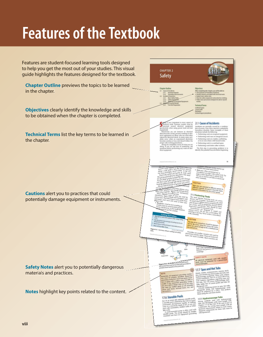 viii Features of the Textbook Cautions alert you to practices that could u ld potentially damage equipment or instruments. st me Safety Notes alert you to potentially dangerous m ma terials ri and practices. Notes highlight key points related to the cont n te nt. Features ur are student-focused learning tools designed d to o help h you get the most out of your studies. This visual v guide highlights the features designed for the te t ex tbook. Chapter Outline previews the topics to o b be learned in the chapter. Objectives clearly identify y the th knowledge and skills to be obtained when the e c ch apter is completed. Technical Terms list the key terms to be learned in the chapter.