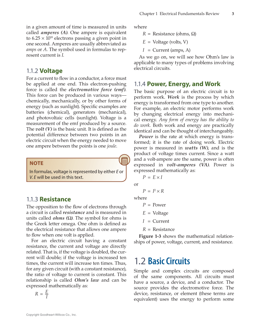 Chapter 1 Electrical Fundamentals Review 3 Copyright Goodheart-Willcox Co., Inc. in a given amount of time is measured in units called amperes (A). One ampere is equivalent to 6.25 × 1018 electrons passing a given point in one second. Amperes are usually abbreviated as amps or A. The symbol used in formulas to rep- resent current is I. 1.1.2 Voltage For a current to fl ow in a conductor, a force must be applied at one end. This electron-pushing force is called the electromotive force (emf). This force can be produced in various ways— chemically, mechanically, or by other forms of energy (such as sunlight). Specifi c examples are batteries (chemical), generators (mechanical), and photovoltaic cells (sunlight). Voltage is a measurement of the emf produced by a source. The volt (V) is the basic unit. It is defi ned as the potential difference between two points in an electric circuit when the energy needed to move one ampere between the points is one joule. 1.1.3 Resistance The opposition to the fl ow of electrons through a circuit is called resistance and is measured in units called ohms (Ω). The symbol for ohms is the Greek letter omega. One ohm is defi ned as the electrical resistance that allows one ampere to fl ow when one volt is applied. For an electric circuit having a constant resistance, the current and voltage are directly related. That is, if the voltage is doubled, the cur- rent will double if the voltage is increased ten times, the current will increase ten times. Thus, for any given circuit (with a constant resistance), the ratio of voltage to current is constant. This relationship is called Ohm’s law and can be expressed mathematically as: R = E _ I NOTE In formulas, voltage is represented by either E or V. E will be used in this text. where R = Resistance (ohms, Ω) E = Voltage (volts, V) I = Current (amps, A) As we go on, we will see how Ohm’s law is applicable to many types of problems involving electrical circuits. 1.1.4 Power, Energy, and Work The basic purpose of an electric circuit is to perform work. Work is the process by which energy is transformed from one type to another. For example, an electric motor performs work by changing electrical energy into mechani- cal energy. Any form of energy has the ability to do work. Both work and energy are practically identical and can be thought of interchangeably. Power is the rate at which energy is trans- formed it is the rate of doing work. Electric power is measured in watts (W), and is the product of voltage times current. Since a watt and a volt-ampere are the same, power is often expressed in volt-amperes (VA). Power is expressed mathematically as: P = E × I or P = I2 × R where P = Power E = Voltage I = Current R = Resistance Figure 1-3 shows the mathematical relation- ships of power, voltage, current, and resistance. 1.2 Basic Circuits Simple and complex circuits are composed of the same components. All circuits must have a source, a device, and a conductor. The source provides the electromotive force. The device, resistance, or element (these terms are equivalent) uses the energy to perform some