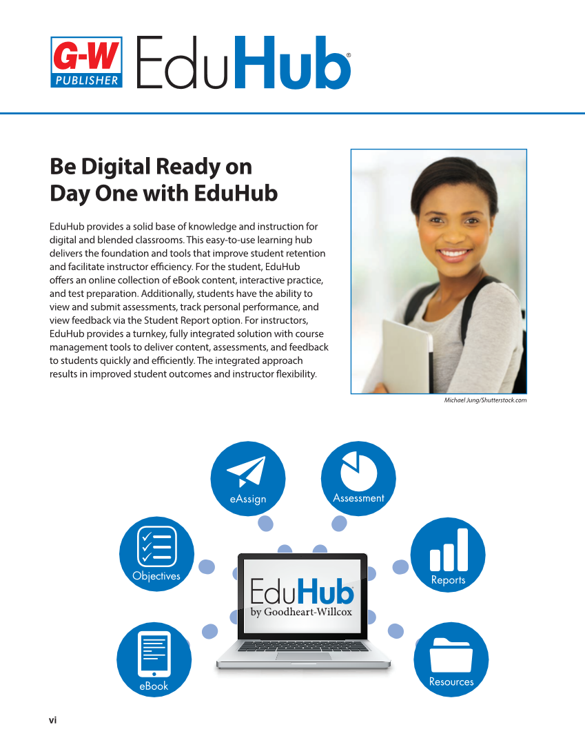 vi eBook Objectives eAssign Reports Resources Assessment Be Digital Ready on Day One with EduHub EduHub provides a solid base of knowledge and instruction for digital and blended classrooms. This easy-to-use learning hub delivers the foundation and tools that improve student retention and facilitate instructor effi ciency. For the student, EduHub off ers an online collection of eBook content, interactive practice, and test preparation. Additionally, students have the ability to view and submit assessments, track personal performance, and view feedback via the Student Report option. For instructors, EduHub provides a turnkey, fully integrated solution with course management tools to deliver content, assessments, and feedback to students quickly and effi ciently. The integrated approach results in improved student outcomes and instructor fl exibility. Michael Jung/Shutterstock.com