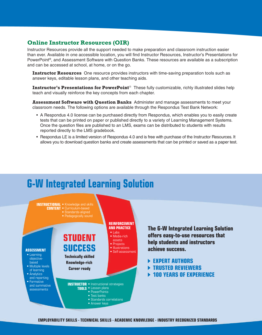 ix EMPLOYABILITY SKILLS ∙ TECHNICAL SKILLS ∙ ACADEMIC KNOWLEDGE ∙ INDUSTRY RECOGNIZED STANDARDS The G-W Integrated Learning Solution offers easy-to-use resources that help students and instructors achieve success. EXPERT AUTHORS TRUSTED REVIEWERS 100 YEARS OF EXPERIENCE G-W Integrated Learning Solution ASSESSMENT • Learning objective- based • Multiple levels of learning • Analytics and reporting • Formative and summative assessments • Knowledge and skills • Curriculum-based • Standards-aligned • Pedagogically sound INSTRUCTIONAL CONTENT INSTRUCTOR TOOLS • Instructional strategies • Lesson plans • PowerPoints • Test banks • Standards correlations • Answer keys REINFORCEMENT AND PRACTICE • Labs • Media-rich assets • Projects • Illustrations • Self-assessment STUDENT SUCCESS Technically skilled Knowledge-rich Career ready Online Instructor Resources (OIR) Instructor Resources provide all the support needed to make preparation and classroom instruction easier than ever. Available in one accessible location, you will find Instructor Resources, Instructor’s Presentations for PowerPoint®, and Assessment Software with Question Banks. These resources are available as a subscription and can be accessed at school, at home, or on the go. Instructor Resources One resource provides instructors with time-saving preparation tools such as answer keys, editable lesson plans, and other teaching aids. Instructor’s Presentations for PowerPoint® These fully customizable, richly illustrated slides help teach and visually reinforce the key concepts from each chapter. Assessment Software with Question Banks Administer and manage assessments to meet your classroom needs. The following options are available through the Respondus Test Bank Network: • A Respondus 4.0 license can be purchased directly from Respondus, which enables you to easily create tests that can be printed on paper or published directly to a variety of Learning Management Systems. Once the question files are published to an LMS, exams can be distributed to students with results reported directly to the LMS gradebook. • Respondus LE is a limited version of Respondus 4.0 and is free with purchase of the Instructor Resources. It allows you to download question banks and create assessments that can be printed or saved as a paper test.