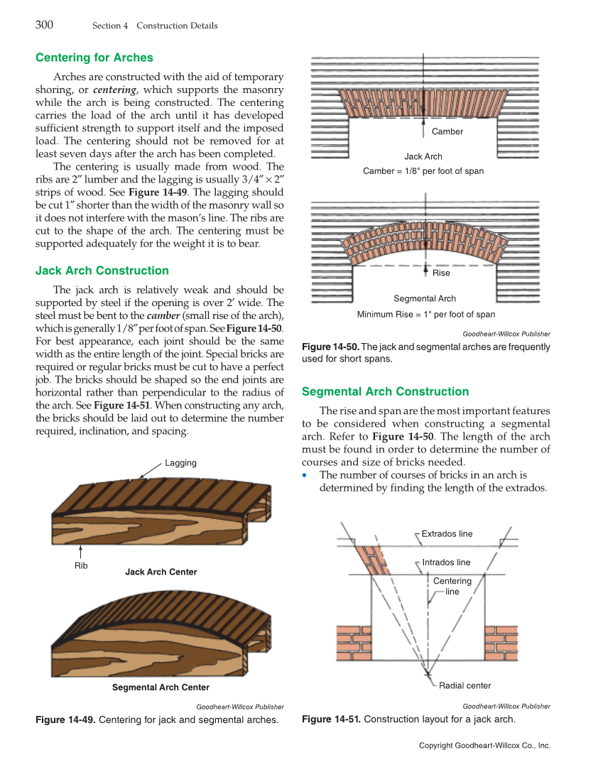 Copyright Goodheart-Willcox Co., Inc. 300 Section 4 Construction Details Centering for Arches Arches are constructed with the aid of temporary shoring, or centering, which supports the masonry while the arch is being constructed. The centering carries the load of the arch until it has developed sufficient strength to support itself and the imposed load. The centering should not be removed for at least seven days after the arch has been completed. The centering is usually made from wood. The ribs are 2″ lumber and the lagging is usually 3/4″ × 2″ strips of wood. See Figure 14-49. The lagging should be cut 1″ shorter than the width of the masonry wall so it does not interfere with the mason’s line. The ribs are cut to the shape of the arch. The centering must be supported adequately for the weight it is to bear. Jack Arch Construction The jack arch is relatively weak and should be supported by steel if the opening is over 2′ wide. The steel must be bent to the camber (small rise of the arch), which is generally 1/8″per foot of span. See Figure 14-50. For best appearance, each joint should be the same width as the entire length of the joint. Special bricks are required or regular bricks must be cut to have a perfect job. The bricks should be shaped so the end joints are horizontal rather than perpendicular to the radius of the arch. See Figure 14-51. When constructing any arch, the bricks should be laid out to determine the number required, inclination, and spacing. Segmental Arch Construction The rise and span are the most important features to be considered when constructing a segmental arch. Refer to Figure 14-50. The length of the arch must be found in order to determine the number of courses and size of bricks needed. • The number of courses of bricks in an arch is determined by finding the length of the extrados. Goodheart-Willcox Publisher Figure 14-49. Centering for jack and segmental arches. Lagging Rib Jack Arch Center Segmental Arch Center Goodheart-Willcox Publisher Figure 14-50. The jack and segmental arches are frequently used for short spans. Camber Jack Arch Camber = 1/8" per foot of span Rise Segmental Arch Minimum Rise = 1" per foot of span Goodheart-Willcox Publisher Figure 14-51. Construction layout for a jack arch. Extrados line Intrados line Radial center Centering line