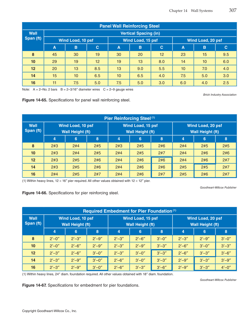 Copyright Goodheart-Willcox Co., Inc. Chapter 14 Wall Systems 307 Panel Wall Reinforcing Steel Wall Span (ft) Vertical Spacing (in) Wind Load, 10 psf Wind Load, 15 psf Wind Load, 20 psf A B C A B C A B C 8 45 30 19 30 20 12 23 15 9.5 10 29 19 12 19 13 8.0 14 10 6.0 12 20 13 8.5 13 9.0 5.5 10 7.0 4.0 14 15 10 6.5 10 6.5 4.0 7.5 5.0 3.0 16 11 7.5 5.0 7.5 5.0 3.0 6.0 4.0 2.5 Note: A = 2–No. 2 bars B = 2–3/16″ diameter wires C = 2–9 gauge wires Brick Industry Association Figure 14-65. Specifications for panel wall reinforcing steel. Pier Reinforcing Steel (1) Wall Span (ft) Wind Load, 10 psf Wall Height (ft) Wind Load, 15 psf Wall Height (ft) Wind Load, 20 psf Wall Height (ft) 4 6 8 4 6 8 4 6 8 8 2#3 2#4 2#5 2#3 2#5 2#6 2#4 2#5 2#5 10 2#3 2#4 2#5 2#4 2#5 2#7 2#4 2#6 2#6 12 2#3 2#5 2#6 2#4 2#6 2#6 2#4 2#6 2#7 14 2#3 2#5 2#6 2#4 2#6 2#6 2#5 2#5 2#7 16 2#4 2#5 2#7 2#4 2#6 2#7 2#5 2#6 2#7 (1) Within heavy lines, 12 × 16″ pier required. All other values obtained with 12 × 12″ pier. Goodheart-Willcox Publisher Figure 14-66. Specifications for pier reinforcing steel. Required Embedment for Pier Foundation (1) Wall Span (ft) Wind Load, 10 psf Wall Height (ft) Wind Load, 15 psf Wall Height (ft) Wind Load, 20 psf Wall Height (ft) 4 6 8 4 6 8 4 6 8 8 2′–0″ 2′–3″ 2′–9″ 2′–3″ 2′–6″ 3′–0″ 2′–3″ 2′–9″ 3′–0″ 10 2′–0″ 2′–6″ 2′–9″ 2′–3″ 2′–9″ 3′–3″ 2′–6″ 3′–0″ 3′–3″ 12 2′–3″ 2′–6″ 3′–0″ 2′–3″ 3′–0″ 3′–3″ 2′–6″ 3′–3″ 3′–6″ 14 2′–3″ 2′–9″ 3′–0″ 2′–6″ 3′–0″ 3′–3″ 2′–9″ 3′–3″ 3′–9″ 16 2′–3″ 2′–9″ 3′–0″ 2′–6″ 3′–3″ 3′–6″ 2′–9″ 3′–3″ 4′–0″ (1) Within heavy lines, 24″ diam. foundation required. All other values obtained with 18″ diam. foundation. Goodheart-Willcox Publisher Figure 14-67. Specifications for embedment for pier foundations.