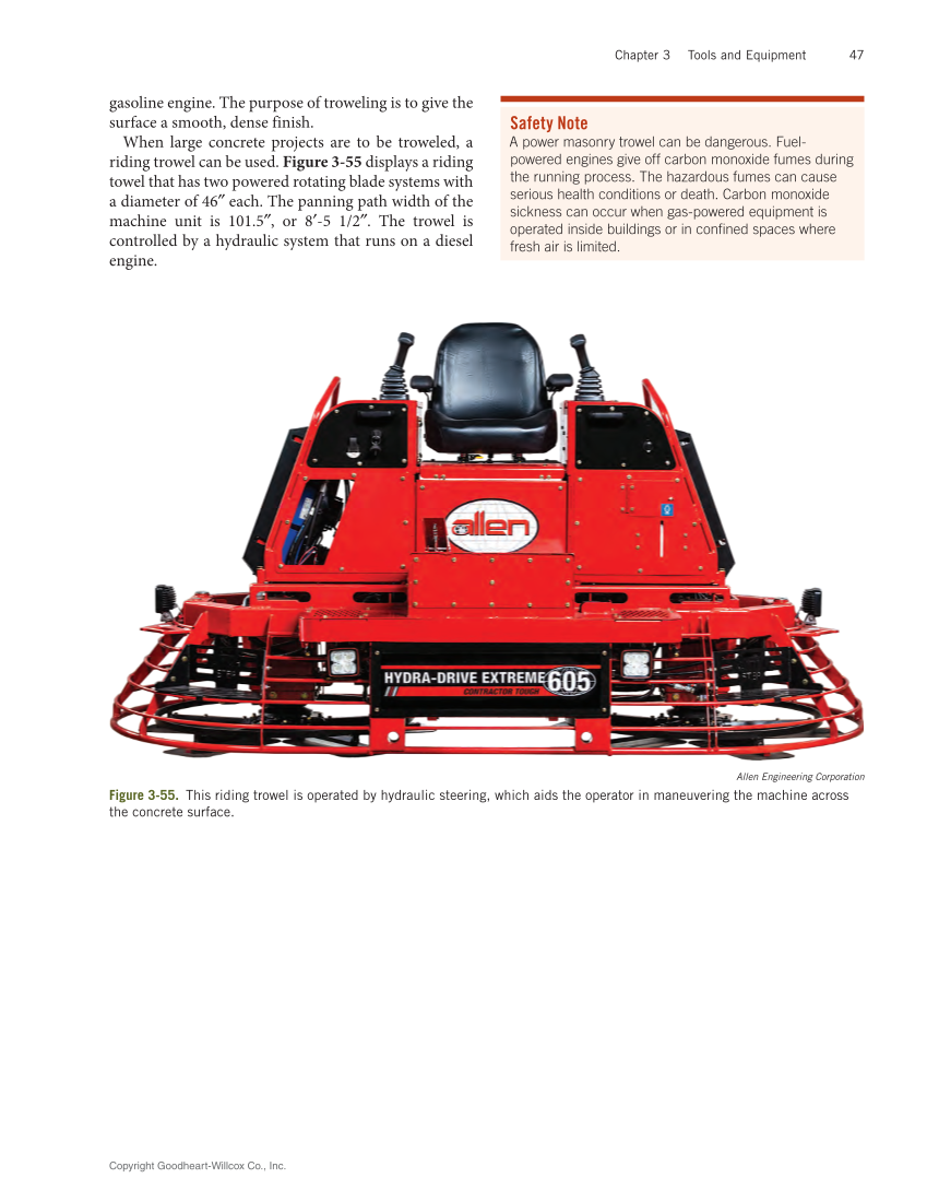 Copyright Goodheart-Willcox Co., Inc. Chapter 3 Tools and Equipment 47 gasoline engine. The purpose of troweling is to give the surface a smooth, dense finish. When large concrete projects are to be troweled, a riding trowel can be used. Figure 3‑55 displays a riding towel that has two powered rotating blade systems with a diameter of 46″ each. The panning path width of the machine unit is 101.5″, or 8′-5 1/2″. The trowel is controlled by a hydraulic system that runs on a diesel engine. Safety Note A power masonry trowel can be dangerous. Fuel- powered engines give off carbon monoxide fumes during the running process. The hazardous fumes can cause serious health conditions or death. Carbon monoxide sickness can occur when gas-powered equipment is operated inside buildings or in confined spaces where fresh air is limited. Allen Engineering Corporation Figure 3‑55. This riding trowel is operated by hydraulic steering, which aids the operator in maneuvering the machine across the concrete surface.