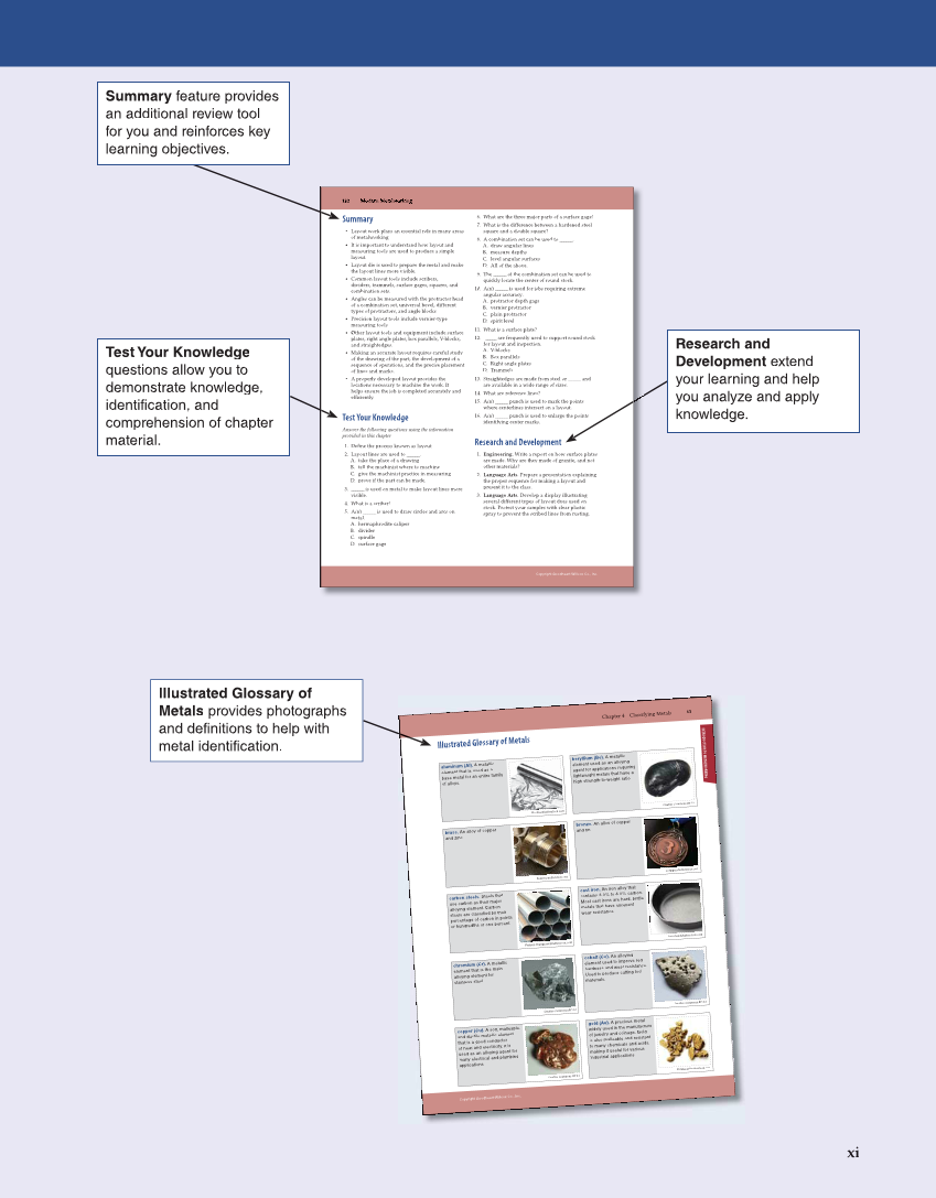 xi Copyright Goodheart-Willcox Co., Inc. 132 132 Modern MetalworkingMetalworking Modern Summary • Layout work plays an essential role in many areas of metalworking. • It is important to understand how layout and measuring tools are used to produce a simple layout. • Layout die is used to prepare the metal and make the layout lines more visible. • Common layout tools include scribers, dividers, trammels, surface gages, squares, and combination sets. • Angles can be measured with the protractor head of a combination set, universal bevel, different types of protractors, and angle blocks. • Precision layout tools include vernier-type measuring tools. • Other layout tools and equipment include surface plates, right angle plates, box parallels, V-blocks, and straightedges. • Making an accurate layout requires careful study of the drawing of the part, the development of a sequence of operations, and the precise placement of lines and marks. • A properly developed layout provides the locations necessary to machine the work. It helps ensure the job is completed accurately and effi ficiently. Test Your Knowledge Answer the following questions using the information provided in this chapter. 1. Defi ne the process known as layout. fi 2. Layout lines are used to ______. A. take the place of a drawing B. tell the machinist where to machine C. give the machinist practice in measuring D. prove if the part can be made. 3. ______ is used on metal to make layout lines more visible. 4. What is a scriber? 5. A(n) ______ is used to draw circles and arcs on metal. A. hermaphrodite caliper B. divider C. spindle D. surface gage 6. What are the three major parts of a surface gage? 7. What is the difference between a hardened steel square and a double square? 8. A combination set can be used to ______. A. draw angular lines B. measure depths C. level angular surfaces D. All of the above. 9. The ______ of the combination set can be used to quickly locate the center of round stock. 10. A(n) ______ is used for jobs requiring extreme angular accuracy. A. protractor depth gage B. vernier protractor C. plain protractor D. spirit level 11. What is a surface plate? 12. ______ are frequently used to support round stock for layout and inspection. A. V-blocks B. Box parallels C. Right angle plates D. Trammels 13. Straightedges are made from steel or _____ and are available in a wide range of sizes. 14. What are reference lines? 15. A(n) ______ punch is used to mark the points where centerlines intersect on a layout. 16. A(n) ______ punch is used to enlarge the points identifying center marks. Research and Development 1. Engineering. Write a report on how surface plates are made. Why are they made of granite, and not other materials? 2. Language Arts. Prepare a presentation explaining the proper sequence for making a layout and present it to the class. 3. Language Arts. Develop a display illustrating several different types of layout dyes used on stock. Protect your samples with clear plastic spray to prevent the scribed lines from rusting. INTRODUCTION TO METALWORKING Copyright Goodheart-Willcox Co., Inc. Chapter 4 Classifying Metals 63 aluminum (Al). A metallic element that is used as a base metal for an entire family of alloys. Picsfive/Shutterstock.com beryllium (Be). A metallic element used as an alloying agent for applications requiring lightweight metals that have a high strength-to-weight ratio. Creative Commons BY 3.0 brass. An alloy of copper and zinc. flegere/Shutterstock.com bronze. An alloy of copper and tin. sergign/Shutterstock.com carbon steels. Steels that use carbon as their major alloying element. Carbon steels are classified by their percentage of carbon in points or hundredths of one percent. Praiwun Thungsarn/Shutterstock.com cast iron. An iron alloy that contains 3.0% to 4.0% carbon. Most cast irons are hard, brittle metals that have excellent wear resistance. bonchan/Shutterstock.com chromium (Cr). A metallic element that is the main alloying element for stainless steel. Creative Commons BY 3.0 cobalt (Co). An alloying element used to improve red hardness and wear resistance. Used to produce cutting tool materials. Creative Commons BY 3.0 copper (Cu). A soft, malleable, and ductile metallic element that is a good conductor of heat and electricity. It is used as an alloying agent for many electrical and plumbing applications. Creative Commons BY 3.0 gold (Au). A precious metal widely used in the manufacture of jewelry and coinage. Gold is also malleable and resistant to many chemicals and acids, making it useful for various industrial applications. Eli Maier/Shutterstock.com Illustrated Glossary of Metals Summary feature provides an additional review tool for you and reinforces key learning objectives. Test Your Knowledge questions allow you to demonstrate knowledge, identification, and comprehension of chapter material. Research and Development extend your learning and help you analyze and apply knowledge. Illustrated Glossary of Metals provides photographs and definitions to help with metal identification.
