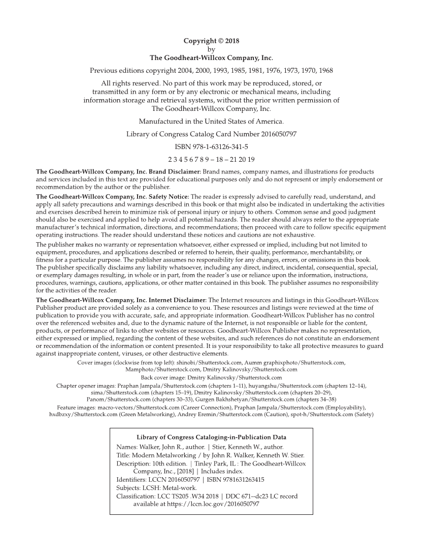 Copyright © 2018 by The Goodheart-Willcox Company, Inc. Previous editions copyright 2004, 2000, 1993, 1985, 1981, 1976, 1973, 1970, 1968 All rights reserved. No part of this work may be reproduced, stored, or transmitted in any form or by any electronic or mechanical means, including information storage and retrieval systems, without the prior written permission of The Goodheart-Willcox Company, Inc. Manufactured in the United States of America. Library of Congress Catalog Card Number 2016050797 ISBN 978-1-63126-341-5 2 3 4 5 6 7 8 9 – 18 – 21 20 19 The Goodheart-Willcox Company, Inc. Brand Disclaimer: Brand names, company names, and illustrations for products and services included in this text are provided for educational purposes only and do not represent or imply endorsement or recommendation by the author or the publisher. The Goodheart-Willcox Company, Inc. Safety Notice: The reader is expressly advised to carefully read, understand, and apply all safety precautions and warnings described in this book or that might also be indicated in undertaking the activities and exercises described herein to minimize risk of personal injury or injury to others. Common sense and good judgment should also be exercised and applied to help avoid all potential hazards. The reader should always refer to the appropriate manufacturer’s technical information, directions, and recommendations then proceed with care to follow specifi c equipment operating instructions. The reader should understand these notices and cautions are not exhaustive. The publisher makes no warranty or representation whatsoever, either expressed or implied, including but not limited to equipment, procedures, and applications described or referred to herein, their quality, performance, merchantability, or fi tness for a particular purpose. The publisher assumes no responsibility for any changes, errors, or omissions in this book. The publisher specifi cally disclaims any liability whatsoever, including any direct, indirect, incidental, consequential, special, or exemplary damages resulting, in whole or in part, from the reader’s use or reliance upon the information, instructions, procedures, warnings, cautions, applications, or other matter contained in this book. The publisher assumes no responsibility for the activities of the reader. The Goodheart-Willcox Company, Inc. Internet Disclaimer: The Internet resources and listings in this Goodheart-Willcox Publisher product are provided solely as a convenience to you. These resources and listings were reviewed at the time of publication to provide you with accurate, safe, and appropriate information. Goodheart-Willcox Publisher has no control over the referenced websites and, due to the dynamic nature of the Internet, is not responsible or liable for the content, products, or performance of links to other websites or resources. Goodheart-Willcox Publisher makes no representation, either expressed or implied, regarding the content of these websites, and such references do not constitute an endorsement or recommendation of the information or content presented. It is your responsibility to take all protective measures to guard against inappropriate content, viruses, or other destructive elements. Cover images (clockwise from top left): shinobi/Shutterstock.com, Aumm graphixphoto/Shutterstock.com, Mamphoto/Shutterstock.com, Dmitry Kalinovsky/Shutterstock.com Back cover image: Dmitry Kalinovsky/Shutterstock.com Chapter opener images: Praphan Jampala/Shutterstock.com (chapters 1–11), huyangshu/Shutterstock.com (chapters 12–14), sima/Shutterstock.com (chapters 15–19), Dmitry Kalinovsky/Shutterstock.com (chapters 20–29), Panom/Shutterstock.com (chapters 30–33), Gurgen Bakhshetyan/Shutterstock.com (chapters 34–38) Feature images: macro-vectors/Shutterstock.com (Career Connection), Praphan Jampala/Shutterstock.com (Employability), hxdbzxy/Shutterstock.com (Green Metalworking), Andrey Eremin/Shutterstock.com (Caution), spot-h/Shutterstock.com (Safety) Library of Congress Cataloging-in-Publication Data Names: Walker, John R., author. | Stier, Kenneth W., author. Title: Modern Metalworking / by John R. Walker, Kenneth W. Stier. Description: 10th edition. | Tinley Park, IL : The Goodheart-Willcox Company, Inc., [2018] | Includes index. Identifi ers: LCCN 2016050797 | ISBN 9781631263415 Subjects: LCSH: Metal-work. Classifi cation: LCC TS205 .W34 2018 | DDC 671--dc23 LC record available at https://lccn.loc.gov/2016050797