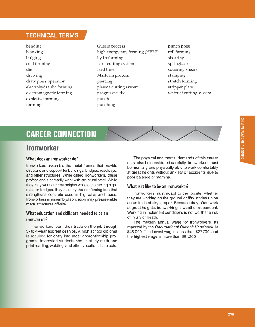 SHEET METAL AND METAL FORMING 275 TECHNICAL TERMS bending blanking bulging cold forming die drawing draw press operation electrohydraulic forming electromagnetic forming explosive forming forming Guerin process high energy rate forming (HERF) hydroforming laser cutting system lead time Marform process piercing plasma cutting system progressive die punch punching punch press roll forming shearing springback squaring shears stamping stretch forming stripper plate waterjet cutting system CAREER CONNECTION Ironworker What W does an ironworker do? Iro o on workers assemble the metal frames that provide str r ru cture and support for buildings, bridges, roadways, and n n other structures. While called ‘ironworkers,’ these pro r of essionals primarily work with structural steel. While the e ey may work at great heights while constructing high- ris s se s or bridges, they also lay the reinforcing iron that str r re ngthens concrete used in highways and roads. Iro o on workers in assembly/fabrication may preassemble metal e structures off-site. What W education and skills are needed to be an ironworker? o o Ironworkers learn their trade on the job through 3- - to 4-year apprenticeships. A high school diploma is required for entry into most apprenticeship pro- grams. r Interested students should study math and print r reading, welding, and other vocational subjects. The physical and mental demands of this career must also be considered carefully. Ironworkers must be mentally and physically able to work comfortably at great heights without anxiety or accidents due to poor balance or stamina. What is it like to be an ironworker? Ironworkers must adapt to the jobsite, whether they are working on the ground or fifty stories up on an unfinished skyscraper. Because they often work at great heights, ironworking is weather-dependent. Working in inclement conditions is not worth the risk k of injury or death. The median annual wage for ironworkers, as reported by the Occupational Outlook Handbook, is $48,000. The lowest wage is less than $27,700, and the highest wage is more than $91,200.