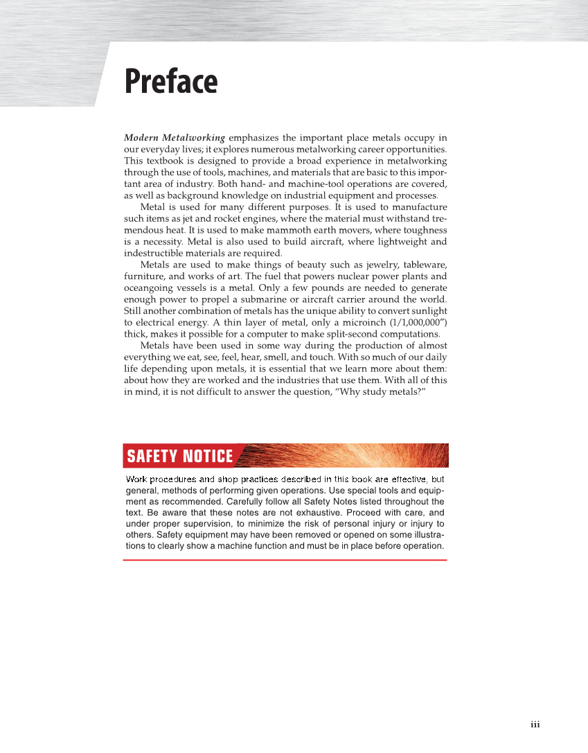 iii Modern Metalworking emphasizes the important place metals occupy in g our everyday lives it explores numerous metalworking career opportunities. This textbook is designed to provide a broad experience in metalworking through the use of tools, machines, and materials that are basic to this impor- tant area of industry. Both hand- and machine-tool operations are covered, as well as background knowledge on industrial equipment and processes. Metal is used for many different purposes. It is used to manufacture such items as jet and rocket engines, where the material must withstand tre- mendous heat. It is used to make mammoth earth movers, where toughness is a necessity. Metal is also used to build aircraft, where lightweight and indestructible materials are required. Metals are used to make things of beauty such as jewelry, tableware, furniture, and works of art. The fuel that powers nuclear power plants and oceangoing vessels is a metal. Only a few pounds are needed to generate enough power to propel a submarine or aircraft carrier around the world. Still another combination of metals has the unique ability to convert sunlight to electrical energy. A thin layer of metal, only a microinch (1/1,000,000″) thick, makes it possible for a computer to make split-second computations. Metals have been used in some way during the production of almost everything we eat, see, feel, hear, smell, and touch. With so much of our daily life depending upon metals, it is essential that we learn more about them: about how they are worked and the industries that use them. With all of this in mind, it is not difficult to answer the question, “Why study metals?” Preface SAFETY NOTICE SAFETY NOTICE general, methods of performing given operations. Use special tools and equip- ment as recommended. Carefully follow all Safety Notes listed throughout the text. Be aware that these notes are not exhaustive. Proceed with care, and under proper supervision, to minimize the risk of personal injury or injury to others. Safety equipment may have been removed or opened on some illustra- tions to clearly show a machine function and must be in place before operation.