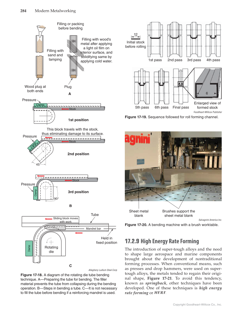 284 Modern Metalworking Copyright Goodheart-Willcox Co., Inc. 17.2.9 High Energy Rate Forming The introduction of super-tough alloys and the need to shape large aerospace and marine components brought about the development of nontraditional forming processes. When conventional means, such as presses and drop hammers, were used on super- tough alloys, the metals tended to regain their origi- nal shape, Figure 17-21. To avoid this tendency, known as springback, other techniques have been developed. One of these techniques is high energy rate forming or g HERF.F F Allegheny Ludlum Steel Corp. Figure 17-18. A diagram of the rotating die tube bending technique. A—Preparing the tube for bending. The filler material prevents the tube from collapsing during the bending operation. B—Steps in bending a tube. C—It is not necessary to fill the tube before bending if a reinforcing mandrel is used. Filling or packing before bending Filling with sand and tamping Wood plug at both ends Pressure Clampp Stock Plug Filling with wood's metal after applying a light oil film on interior surface, and solidifying same by applying cold water. A 1st position 2nd position Pressure 45° This block travels with the stock, thus eliminating damage to its surface. Stock B 3rd position Pressure C lam p Tube 90° Stock C Rotating die Held in fixed position Sliding block moves with work Mandrel bar Clamp Clamp C lam p Goodheart-Willcox Publisher Figure 17-19. Sequence followed for roll forming channel. Initial stock before rolling 1st pass 2nd pass 5th pass 6th pass Final pass Enlarged g view of formed stock 3rd pass 4th pass 12 6 Salvagnini America Inc. Figure 17-20. A bending machine with a brush worktable. Sheet metal blank Brushes support the sheet metal blank