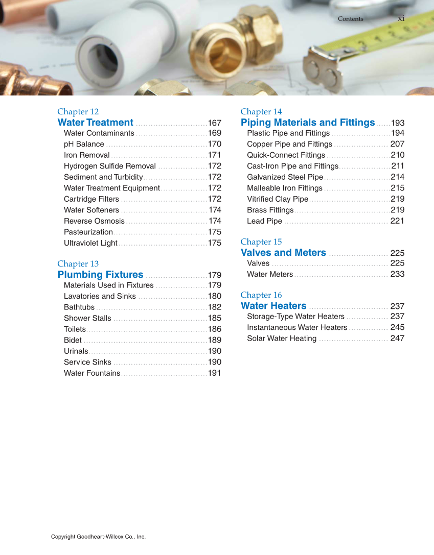 Chapter 14 Piping Materials and Fittings ......193 Plastic Pipe and Fittings ........................194 Copper Pipe and Fittings ...................... 207 Quick-Connect Fittings ..........................210 Cast-Iron Pipe and Fittings.....................211 Galvanized Steel Pipe ...........................214 Malleable Iron Fittings ...........................215 Vitrified Clay Pipe .................................219 Brass Fittings .......................................219 Lead Pipe .......................................... 221 Chapter 15 Valves and Meters ........................ 225 Valves ............................................... 225 Water Meters ...................................... 233 Chapter 16 Water Heaters ................................ 237 Storage-Type Water Heaters ................. 237 Instantaneous Water Heaters ................ 245 Solar Water Heating ............................ 247 Chapter 12 Water Treatment .............................167 Water Contaminants .............................169 pH Balance .........................................170 Iron Removal .......................................171 Hydrogen Sulfide Removal ....................172 Sediment and Turbidity ..........................172 Water Treatment Equipment ...................172 Cartridge Filters ...................................172 Water Softeners ...................................174 Reverse Osmosis .................................174 Pasteurization ......................................175 Ultraviolet Light ....................................175 Chapter 13 Plumbing Fixtures .........................179 Materials Used in Fixtures .....................179 Lavatories and Sinks ............................180 Bathtubs .............................................182 Shower Stalls ......................................185 Toilets.................................................186 Bidet ..................................................189 Urinals ................................................190 Service Sinks ......................................190 Water Fountains ...................................191 Contents xi Copyright Goodheart-Willcox Co., Inc.