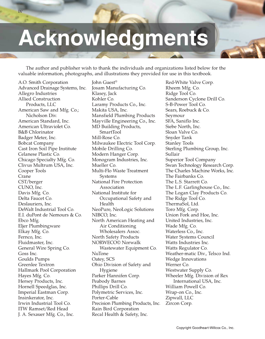 Acknowledgments The author and publisher wish to thank the individuals and organizations listed below for the valuable information, photographs, and illustrations they provided for use in this textbook. A.O. Smith Corporation Advanced Drainage Systems, Inc. Allegro Industries Allied Construction Products, LLC American Saw and Mfg. Co. Nicholson Div. American Standard, Inc. American Ultraviolet Co. B&B Chlorinator Badger Meter, Inc. Bobcat Company Cast Iron Soil Pipe Institute Celanese Plastic Co. Chicago Specialty Mfg. Co. Clivus Multrum USA, Inc. Cooper Tools Crane CST/berger CUNO, Inc. Davis Mfg. Co. Delta Faucet Co. Deslauriers, Inc. DeWalt Industrial Tool Co. E.I. duPont de Nemours & Co. Ebco Mfg. Eljer Plumbingware Elkay Mfg. Co. Fernco, Inc. Fluidmaster, Inc. General Wire Spring Co. Goss Inc. Goulds Pumps Greenlee Textron Hallmark Pool Corporation Hayes Mfg. Co. Hersey Products, Inc. Hornell Speedglas, Inc. Imperial Eastman Corp. Insinkerator, Inc. Irwin Industrial Tool Co. ITW Ramset/Red Head J. A. Sexauer Mfg. Co., Inc. John Guest® Josam Manufacturing Co. Klasey, Jack Kohler Co. Laramy Products Co., Inc. Makita USA, Inc. Mansfield Plumbing Products Mayville Engineering Co., Inc. MD Building Products, SmartTool Mill-Rose Co. Milwaukee Electric Tool Corp. Mobile Drilling Co. Modern Hanger Corp. Monogram Industries, Inc. Mueller Co. Multi-Flo Waste Treatment Systems National Fire Protection Association National Institute for Occupational Safety and Health NeoPure, NeoLogic Solutions NIBCO, Inc. North American Heating and Air Conditioning Wholesalers Assoc. North Safety Products NORWECO© Norwalk Wastewater Equipment Co. NuTone Oatey, SCS Ohio Division of Safety and Hygiene Parker Hannifen Corp. Peabody Barnes Phillips Drill Co. Polymetric Services, Inc. Porter-Cable Precision Plumbing Products, Inc. Rain Bird Corporation Recal Health & Safety, Inc. Red-White Valve Corp. Rheem Mfg. Co. Ridge Tool Co. Sanderson Cyclone Drill Co. S-B-Power Tool Co. Sears, Roebuck & Co. Seymour SFA, Saniflo Inc. Siebe North, Inc. Sloan Valve Co. Snyder Tank Stanley Tools Sterling Plumbing Group, Inc. Sullair Superior Tool Company Swan Technology Research Corp. The Charles Machine Works, Inc. The Fairbanks Co. The L.S. Starrett Co. The L.F. Garlinghouse Co., Inc. The Logan Clay Products Co. The Ridge Tool Co. ThermaSol, Ltd. Toro Mfg. Corp. Union Fork and Hoe, Inc. United Industries, Inc. Wade Mfg. Co. Waterless Co., Inc. Water Systems Council Watts Industries Inc. Watts Regulator Co. Weather-matic Div., Telsco Ind. Wedge Innovations Werner Co. Westwater Supply Co. Wheeler Mfg. Division of Rex International USA, Inc. William Powell Co. Wrap-on Co., Inc. Zipwall, LLC Zircon Corp. iv Copyright Goodheart-Willcox Co., Inc.