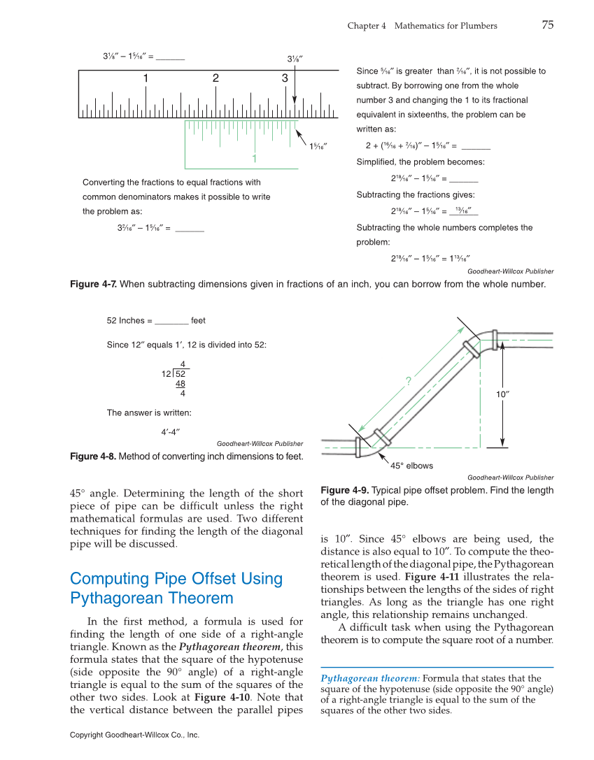 is 10″. Since 45° elbows are being used, the distance is also equal to 10″. To compute the theo- retical length of the diagonal pipe, the Pythagorean theorem is used. Figure 4-11 illustrates the rela- tionships between the lengths of the sides of right triangles. As long as the triangle has one right angle, this relationship remains unchanged. A difficult task when using the Pythagorean theorem is to compute the square root of a number. 45° angle. Determining the length of the short piece of pipe can be difficult unless the right mathematical formulas are used. Two different techniques for finding the length of the diagonal pipe will be discussed. Computing Pipe Offset Using Pythagorean Theorem In the first method, a formula is used for finding the length of one side of a right-angle triangle. Known as the Pythagorean theorem, this formula states that the square of the hypotenuse (side opposite the 90° angle) of a right-angle triangle is equal to the sum of the squares of the other two sides. Look at Figure 4-10. Note that the vertical distance between the parallel pipes 1 1 2 3 31⁄8″ – 15⁄16″ = ______ 15⁄16″ 31⁄8″ Converting the fractions to equal fractions with common denominators makes it possible to write the problem as: 32⁄16″ – 15⁄16″ = ______ Since 5⁄16″ is greater than 2⁄16″, it is not possible to subtract. By borrowing one from the whole number 3 and changing the 1 to its fractional equivalent in sixteenths, the problem can be written as: 2 + (16⁄16 + 2⁄16)″ – 15⁄16″ = ______ Simplified, the problem becomes: 218⁄16″ – 15⁄16″ = ______ Subtracting the fractions gives: 218⁄16″ – 15⁄16″ = ______″16⁄13 Subtracting the whole numbers completes the problem: 218⁄16″ – 15⁄16″ = 113⁄16″ Goodheart-Willcox Publisher Figure 4-7. When subtracting dimensions given in fractions of an inch, you can borrow from the whole number. 52 Inches = _______ feet Since 12″ equals 1′, 12 is divided into 52: 4 12 52 48 4 The answer is written: 4′-4″ Goodheart-Willcox Publisher Figure 4-8. Method of converting inch dimensions to feet. 10″ ? 45° elbows Goodheart-Willcox Publisher Figure 4-9. Typical pipe offset problem. Find the length of the diagonal pipe. Pythagorean theorem: Formula that states that the square of the hypotenuse (side opposite the 90° angle) of a right-angle triangle is equal to the sum of the squares of the other two sides. Chapter 4 Mathematics for Plumbers 75 Copyright Goodheart-Willcox Co., Inc.