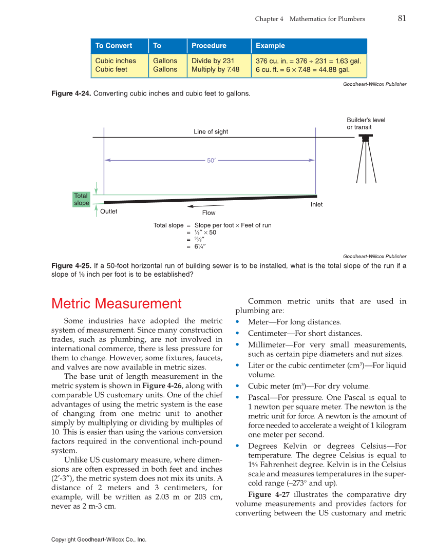 Common metric units that are used in plumbing are: • Meter—For long distances. • Centimeter—For short distances. • Millimeter—For very small measurements, such as certain pipe diameters and nut sizes. • Liter or the cubic centimeter (cm3)—For liquid volume. • Cubic meter (m3)—For dry volume. • Pascal—For pressure. One Pascal is equal to 1 newton per square meter. The newton is the metric unit for force. A newton is the amount of force needed to accelerate a weight of 1 kilogram one meter per second. • Degrees Kelvin or degrees Celsius—For temperature. The degree Celsius is equal to 14⁄5 Fahrenheit degree. Kelvin is in the Celsius scale and measures temperatures in the super- cold range (–273° and up). Figure 4-27 illustrates the comparative dry volume measurements and provides factors for converting between the US customary and metric Metric Measurement Some industries have adopted the metric system of measurement. Since many construction trades, such as plumbing, are not involved in international commerce, there is less pressure for them to change. However, some fixtures, faucets, and valves are now available in metric sizes. The base unit of length measurement in the metric system is shown in Figure 4-26, along with comparable US customary units. One of the chief advantages of using the metric system is the ease of changing from one metric unit to another simply by multiplying or dividing by multiples of 10. This is easier than using the various conversion factors required in the conventional inch-pound system. Unlike US customary measure, where dimen- sions are often expressed in both feet and inches (2′-3″), the metric system does not mix its units. A distance of 2 meters and 3 centimeters, for example, will be written as 2.03 m or 203 cm, never as 2 m-3 cm. Goodheart-Willcox Publisher Figure 4-24. Converting cubic inches and cubic feet to gallons. To Convert To Procedure Example Cubic inches Cubic feet Gallons Gallons Divide by 231 Multiply by 7.48 376 cu. in. = 376 ÷ 231 = 1.63 gal. 6 cu. ft. = 6 × 7.48 = 44.88 gal. Total slope = Slope per foot × Feet of run = 1⁄8″ × 50 = 50⁄8″ = 61⁄4″ 50′ Total slope Outlet Flow Inlet Line of sight Builder’s level or transit Goodheart-Willcox Publisher Figure 4-25. If a 50-foot horizontal run of building sewer is to be installed, what is the total slope of the run if a slope of ⅛ inch per foot is to be established? Chapter 4 Mathematics for Plumbers 81 Copyright Goodheart-Willcox Co., Inc.