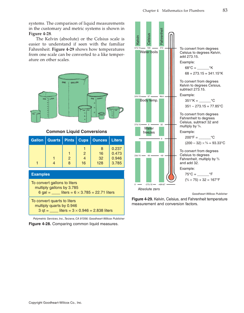systems. The comparison of liquid measurements in the customary and metric systems is shown in Figure 4-28. The Kelvin (absolute) or the Celsius scale is easier to understand if seen with the familiar Fahrenheit. Figure 4-29 shows how temperatures from one scale can be converted to a like temper- ature on other scales. Common Liquid Conversions Gallon Quarts Pints Cups Ounces Liters 1 1 4 1 2 8 1 2 4 16 8 16 32 128 0.237 0.473 0.946 3.785 Polymetric Services, Inc., Tarzana, CA 91356 Goodheart-Willcox Publisher Figure 4-28. Comparing common liquid measures. Examples To convert gallons to liters multiply gallons by 3.785 6 gal = ____ liters = 6 × 3.785 = 22.71 liters To convert quarts to liters multiply quarts by 0.946 3 qt = ____ liters = 3 × 0.946 = 2.838 liters LITER DECI LITER ONE ONE GALLON ONE PINT OUNCE 8 oz CUP ONE QUART 0 373.15 100 212 310.15 37 98.6 273.15 0 32 233.15 40 –40 0 –273.15 –459.67 Fahrenheit Celsius Kelvin Water boils Body temp. Water freezes Absolute zero To convert from degrees Celsius to degrees Kelvin, add 273.15. Example: 68°C = ______°K 68 + 273.15 = 341.15°K To convert from degrees Kelvin to degrees Celsius, subtract 273.15. Example: 351°K = ______°C 351 – 273.15 = 77.85°C To convert from degrees Fahrenheit to degrees Celsius, subtract 32 and multiply by 5⁄9. Example: 200°F = ______°C (200 – 32) × 5⁄9 = 93.33°C To convert from degrees Celsius to degrees Fahrenheit, multiply by 9⁄5 and add 32. Example: 75°C = ______°F (9⁄5 × 75) + 32 = 167°F Goodheart-Willcox Publisher Figure 4-29. Kelvin, Celsius, and Fahrenheit temperature measurement and conversion factors. Chapter 4 Mathematics for Plumbers 83 Copyright Goodheart-Willcox Co., Inc.