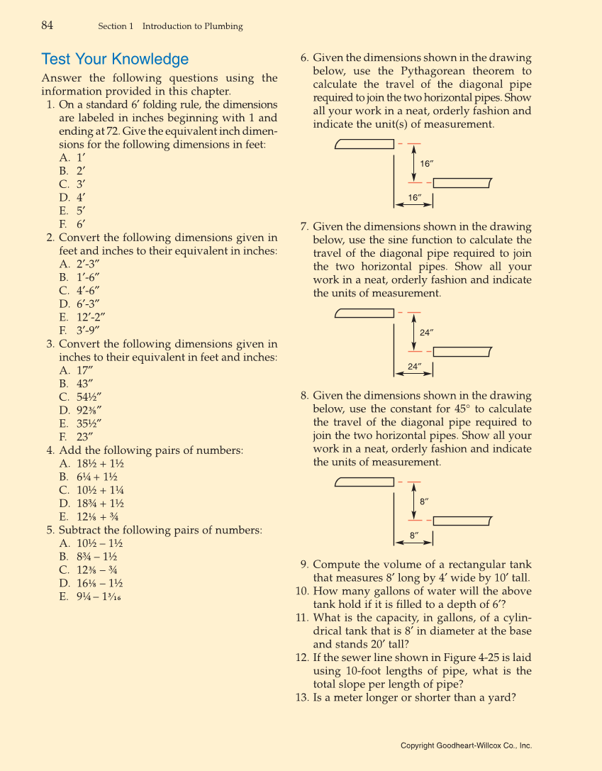 6. Given the dimensions shown in the drawing below, use the Pythagorean theorem to calculate the travel of the diagonal pipe required to join the two horizontal pipes. Show all your work in a neat, orderly fashion and indicate the unit(s) of measurement. 16″ 16″ 7. Given the dimensions shown in the drawing below, use the sine function to calculate the travel of the diagonal pipe required to join the two horizontal pipes. Show all your work in a neat, orderly fashion and indicate the units of measurement. 24″ 24″ 8. Given the dimensions shown in the drawing below, use the constant for 45° to calculate the travel of the diagonal pipe required to join the two horizontal pipes. Show all your work in a neat, orderly fashion and indicate the units of measurement. 8″ 8″ 9. Compute the volume of a rectangular tank that measures 8′ long by 4′ wide by 10′ tall. 10. How many gallons of water will the above tank hold if it is filled to a depth of 6′? 11. What is the capacity, in gallons, of a cylin- drical tank that is 8′ in diameter at the base and stands 20′ tall? 12. If the sewer line shown in Figure 4-25 is laid using 10-foot lengths of pipe, what is the total slope per length of pipe? 13. Is a meter longer or shorter than a yard? Test Your Knowledge Answer the following questions using the information provided in this chapter. 1. On a standard 6′ folding rule, the dimensions are labeled in inches beginning with 1 and ending at 72. Give the equivalent inch dimen- sions for the following dimensions in feet: A. 1′ B. 2′ C. 3′ D. 4′ E. 5′ F. 6′ 2. Convert the following dimensions given in feet and inches to their equivalent in inches: A. 2′-3″ B. 1′-6″ C. 4′-6″ D. 6′-3″ E. 12′-2″ F. 3′-9″ 3. Convert the following dimensions given in inches to their equivalent in feet and inches: A. 17″ B. 43″ C. 54½″ D. 92⅜″ E. 35½″ F. 23″ 4. Add the following pairs of numbers: A. 18½ + 1½ B. 6¼ + 1½ C. 10½ + 1¼ D. 18¾ + 1½ E. 12⅛ + ¾ 5. Subtract the following pairs of numbers: A. 10½ – 1½ B. 8¾ – 1½ C. 12⅜ – ¾ D. 16⅛ – 1½ E. 9¼ – 13⁄16 84 Section 1 Introduction to Plumbing Copyright Goodheart-Willcox Co., Inc.