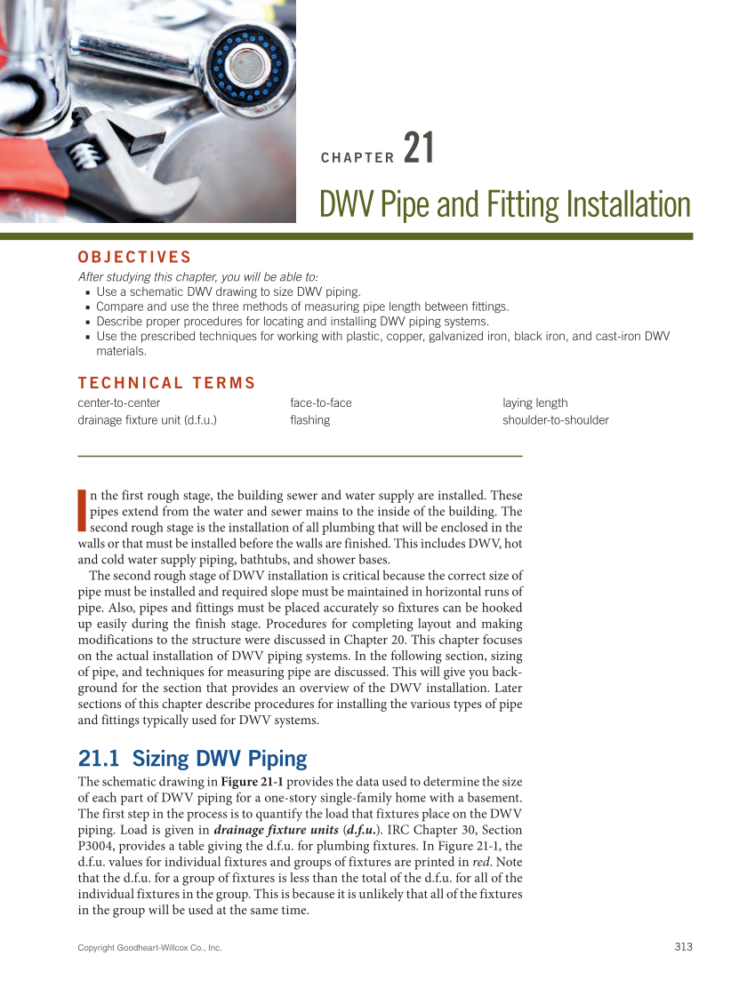 Copyright Goodheart-Willcox Co., Inc. 313 OBJECTIVES After studying this chapter, you will be able to: ■ ■■ Use a schematic DWV drawing to size DWV piping. ■■ Compare and use the three methods of measuring pipe length between fittings. ■■ Describe proper procedures for locating and installing DWV piping systems. ■ Use the prescribed techniques for working with plastic, copper, galvanized iron, black iron, and cast-iron DWV materials. TECHNICAL TERMS center-to-center drainage fixture unit (d.f.u.) face-to-face flashing laying length shoulder-to-shoulder Isecond n the first rough stage, the building sewer and water supply are installed. These pipes extend from the water and sewer mains to the inside of the building. The rough stage is the installation of all plumbing that will be enclosed in the walls or that must be installed before the walls are finished. This includes DWV, hot and cold water supply piping, bathtubs, and shower bases. The second rough stage of DWV installation is critical because the correct size of pipe must be installed and required slope must be maintained in horizontal runs of pipe. Also, pipes and fittings must be placed accurately so fixtures can be hooked up easily during the finish stage. Procedures for completing layout and making modifications to the structure were discussed in Chapter 20. This chapter focuses on the actual installation of DWV piping systems. In the following section, sizing of pipe, and techniques for measuring pipe are discussed. This will give you back- ground for the section that provides an overview of the DWV installation. Later sections of this chapter describe procedures for installing the various types of pipe and fittings typically used for DWV systems. 21.1 Sizing DWV Piping The schematic drawing in Figure 21-1 provides the data used to determine the size of each part of DWV piping for a one-story single-family home with a basement. The first step in the process is to quantify the load that fixtures place on the DWV piping. Load is given in drainage fixture units (d.f.u.). IRC Chapter 30, Section P3004, provides a table giving the d.f.u. for plumbing fixtures. In Figure 21-1, the d.f.u. values for individual fixtures and groups of fixtures are printed in red. Note that the d.f.u. for a group of fixtures is less than the total of the d.f.u. for all of the individual fixtures in the group. This is because it is unlikely that all of the fixtures in the group will be used at the same time. C H A P T ER 21 DWV Pipe and Fitting Installation