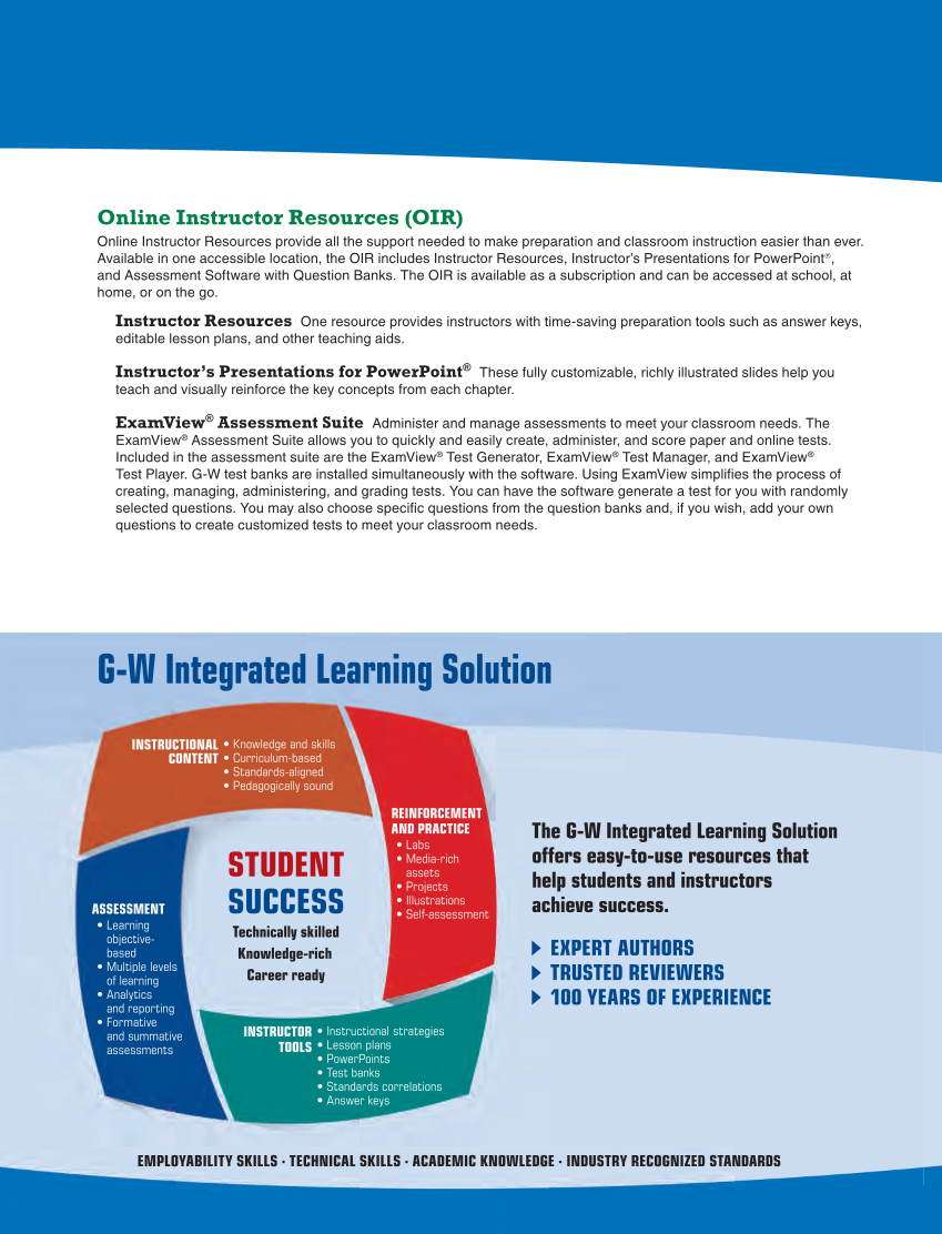 vii Online Instructor Resources (OIR) Online Instructor Resources provide all the support needed to make preparation and classroom instruction easier than ever. Available in one accessible location, the OIR includes Instructor Resources, Instructor’s Presentations for PowerPoint®, and Assessment Software with Question Banks. The OIR is available as a subscription and can be accessed at school, at home, or on the go. Instructor Resources One resource provides instructors with time-saving preparation tools such as answer keys, editable lesson plans, and other teaching aids. Instructor’s Presentations for PowerPoint® These fully customizable, richly illustrated slides help you teach and visually reinforce the key concepts from each chapter. ExamView® Assessment Suite Administer and manage assessments to meet your classroom needs. The ExamView® Assessment Suite allows you to quickly and easily create, administer, and score paper and online tests. Included in the assessment suite are the ExamView® Test Generator, ExamView® Test Manager, and ExamView® Test Player. G-W test banks are installed simultaneously with the software. Using ExamView simplifies the process of creating, managing, administering, and grading tests. You can have the software generate a test for you with randomly selected questions. You may also choose specific questions from the question banks and, if you wish, add your own questions to create customized tests to meet your classroom needs. EMPLOYABILITY SKILLS uni2219 TECHNICAL SKILLS uni2219 ACADEMIC KNOWLEDGE uni2219 INDUSTRY RECOGNIZED STANDARDS The G-W Integrated Learning Solution offers easy-to-use resources that help students and instructors achieve success. EXPERT AUTHORS TRUSTED REVIEWERS 100 YEARS OF EXPERIENCE G-W Integrated Learning Solution ASSESSMENT • Learning objective- based • Multiple levels of learning • Analytics and reporting • Formative and summative assessments • Knowledge and skills • Curriculum-based • Standards-aligned • Pedagogically sound INSTRUCTIONAL CONTENT INSTRUCTOR TOOLS • Instructional strategies • Lesson plans • PowerPoints • Test banks • Standards correlations • Answer keys REINFORCEMENT AND PRACTICE • Labs • Media-rich assets • Projects • Illustrations • Self-assessment STUDENT SUCCESS Technically skilled Knowledge-rich Career ready