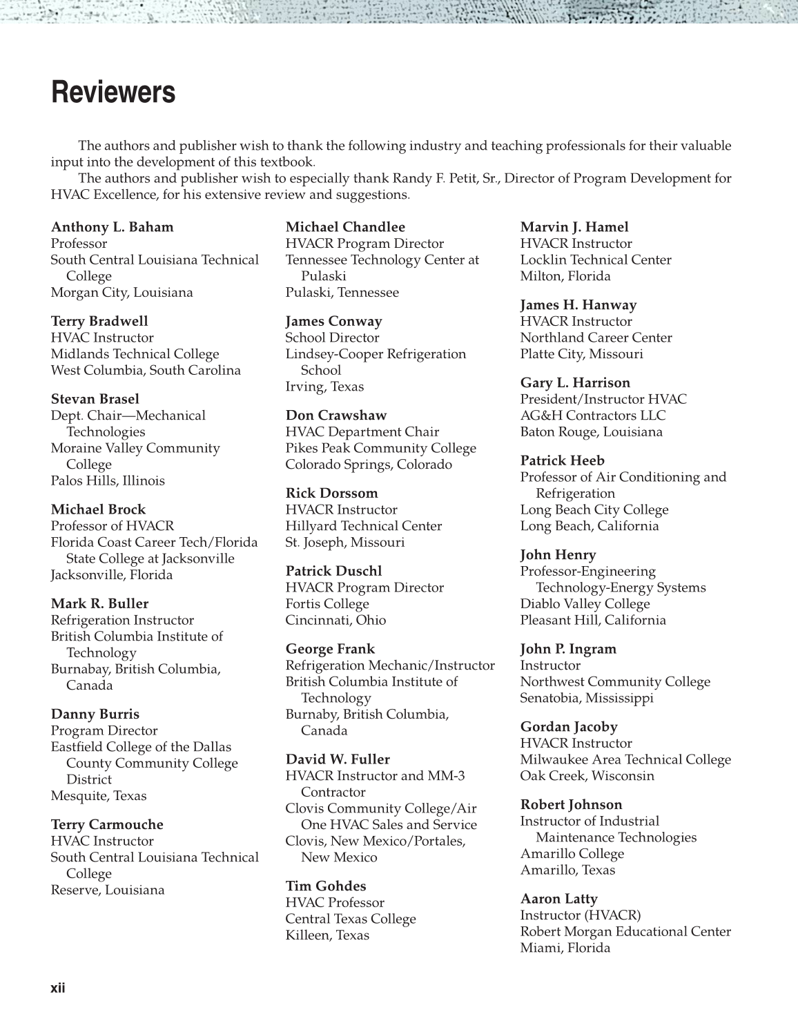 The authors and publisher wish to thank the following industry and teaching professionals for their valuable