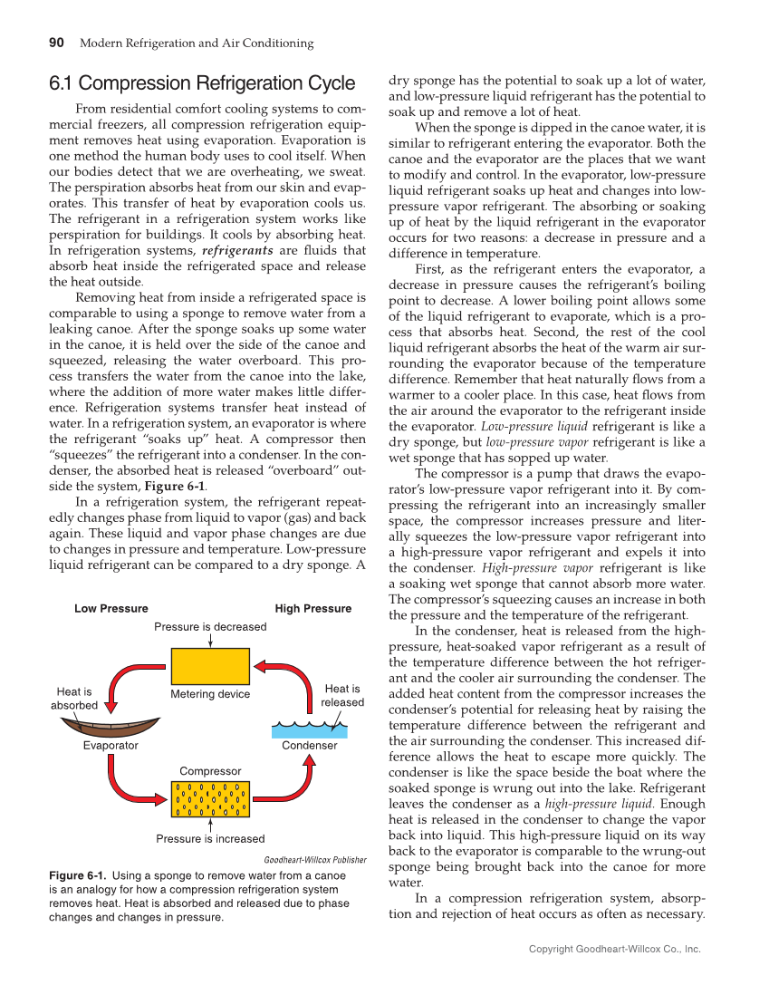 90 Modern Refrigeration and Air Conditioning Copyright Goodheart-Willcox Co., Inc. 6.1 Compression Refrigeration Cycle From residential comfort cooling systems to com- mercial freezers, all compression refrigeration equip- ment removes heat using evaporation. Evaporation is one method the human body uses to cool itself. When our bodies detect that we are overheating, we sweat. The perspiration absorbs heat from our skin and evap- orates. This transfer of heat by evaporation cools us. The refrigerant in a refrigeration system works like perspiration for buildings. It cools by absorbing heat. In refrigeration systems, refrigerants are fluids that absorb heat inside the refrigerated space and release the heat outside. Removing heat from inside a refrigerated space is comparable to using a sponge to remove water from a leaking canoe. After the sponge soaks up some water in the canoe, it is held over the side of the canoe and squeezed, releasing the water overboard. This pro- cess transfers the water from the canoe into the lake, where the addition of more water makes little differ- ence. Refrigeration systems transfer heat instead of water. In a refrigeration system, an evaporator is where the refrigerant “soaks up” heat. A compressor then “squeezes” the refrigerant into a condenser. In the con- denser, the absorbed heat is released “overboard” out- side the system, Figure 6-1. In a refrigeration system, the refrigerant repeat- edly changes phase from liquid to vapor (gas) and back again. These liquid and vapor phase changes are due to changes in pressure and temperature. Low-pressure liquid refrigerant can be compared to a dry sponge. A dry sponge has the potential to soak up a lot of water, and low-pressure liquid refrigerant has the potential to soak up and remove a lot of heat. When the sponge is dipped in the canoe water, it is similar to refrigerant entering the evaporator. Both the canoe and the evaporator are the places that we want to modify and control. In the evaporator, low-pressure liquid refrigerant soaks up heat and changes into low- pressure vapor refrigerant. The absorbing or soaking up of heat by the liquid refrigerant in the evaporator occurs for two reasons: a decrease in pressure and a difference in temperature. First, as the refrigerant enters the evaporator, a decrease in pressure causes the refrigerant’s boiling point to decrease. A lower boiling point allows some of the liquid refrigerant to evaporate, which is a pro- cess that absorbs heat. Second, the rest of the cool liquid refrigerant absorbs the heat of the warm air sur- rounding the evaporator because of the temperature difference. Remember that heat naturally flows from a warmer to a cooler place. In this case, heat flows from the air around the evaporator to the refrigerant inside the evaporator. Low-pressure liquid refrigerant is like a dry sponge, but low-pressure vapor refrigerant is like a wet sponge that has sopped up water. The compressor is a pump that draws the evapo- rator’s low-pressure vapor refrigerant into it. By com- pressing the refrigerant into an increasingly smaller space, the compressor increases pressure and liter- ally squeezes the low-pressure vapor refrigerant into a high-pressure vapor refrigerant and expels it into the condenser. High-pressure vapor refrigerant is like a soaking wet sponge that cannot absorb more water. The compressor’s squeezing causes an increase in both the pressure and the temperature of the refrigerant. In the condenser, heat is released from the high- pressure, heat-soaked vapor refrigerant as a result of the temperature difference between the hot refriger- ant and the cooler air surrounding the condenser. The added heat content from the compressor increases the condenser’s potential for releasing heat by raising the temperature difference between the refrigerant and the air surrounding the condenser. This increased dif- ference allows the heat to escape more quickly. The condenser is like the space beside the boat where the soaked sponge is wrung out into the lake. Refrigerant leaves the condenser as a high-pressure liquid. Enough heat is released in the condenser to change the vapor back into liquid. This high-pressure liquid on its way back to the evaporator is comparable to the wrung-out sponge being brought back into the canoe for more water. In a compression refrigeration system, absorp- tion and rejection of heat occurs as often as necessary. Goodheart-Willcox Publisher Figure 6-1. Using a sponge to remove water from a canoe is an analogy for how a compression refrigeration system removes heat. Heat is absorbed and released due to phase changes and changes in pressure. Evaporator Heat is absorbed Metering device Heat is released Condenser Compressor Pressure is increased Low Pressure High Pressure Pressure is decreased