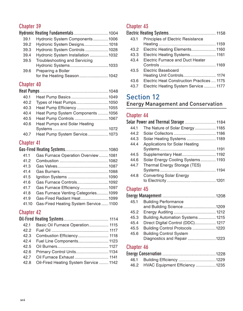 xvi Chapter 39 Hydronic Heating Fundamentals ............................1004 39.1 Hydronic System Components .............1006 39.2 Hydronic System Designs .....................1018 39.3 Hydronic System Controls ....................1028 39.4 Hydronic System Installation ................1032 39.5 Troubleshooting and Servicing Hydronic Systems .................................1033 39.6 Preparing a Boiler for the Heating Season .........................1042 Chapter 40 Heat Pumps .......................................................1048 40.1 Heat Pump Basics ................................1049 40.2 Types of Heat Pumps ............................1050 40.3 Heat Pump Efficiency ...........................1055 40.4 Heat Pump System Components .........1056 40.5 Heat Pump Controls .............................1067 40.6 Heat Pumps and Solar Heating Systems ................................................1072 40.7 Heat Pump System Service ..................1073 Chapter 41 Gas-Fired Heating Systems...................................1080 41.1 Gas Furnace Operation Overview ........1081 41.2 Combustion ..........................................1082 41.3 Gas Valves ............................................1087 41.4 Gas Burners..........................................1088 41.5 Ignition Systems ...................................1090 41.6 Gas Furnace Controls ...........................1092 41.7 Gas Furnace Efficiency .........................1097 41.8 Gas Furnace Venting Categories ..........1099 41.9 Gas-Fired Radiant Heat ........................1099 41.10 Gas-Fired Heating System Service ......1100 Chapter 42 Oil-Fired Heating Systems .................................... 1114 42.1 Basic Oil Furnace Operation................. 1115 42.2 Fuel Oil ................................................. 1117 42.3 Combustion Efficiency .......................... 1118 42.4 Fuel Line Components ..........................1123 42.5 Oil Burners ............................................1127 42.6 Primary Control Units............................1134 42.7 Oil Furnace Exhaust ............................. 1141 42.8 Oil-Fired Heating System Service ........1142 Chapter 43 Electric Heating Systems ...................................... 1158 43.1 Principles of Electric Resistance Heating .................................................1159 43.2 Electric Heating Elements .....................1160 43.3 Electric Heating Systems ...................... 1161 43.4 Electric Furnace and Duct Heater Controls ................................................1169 43.5 Electric Baseboard Heating Unit Controls ............................ 1174 43.6 Electric Heat Construction Practices .... 1175 43.7 Electric Heating System Service ..........1177 Section 12 Energy Management and Conservation Chapter 44 Solar Power and Thermal Storage ......................... 1184 44.1 The Nature of Solar Energy ..................1185 44.2 Solar Collectors ....................................1186 44.3 Solar Heating Systems .........................1189 44.4 Applications for Solar Heating Systems ................................................ 1191 44.5 Supplementary Heat .............................1192 44.6 Solar Energy Cooling Systems .............1193 44.7 Thermal Energy Storage (TES) Systems ................................................1194 44.8 Converting Solar Energy to Electricity ..........................................1201 Chapter 45 Energy Management ...........................................1208 45.1 Building Performance and Building Science ............................1209 45.2 Energy Auditing ....................................1212 45.3 Building Automation Systems ...............1215 45.4 Direct Digital Control (DDC) ..................1217 45.5 Building Control Protocols ....................1220 45.6 Building Control System Diagnostics and Repair ........................1223 Chapter 46 Energy Conservation ...........................................1228 46.1 Building Efficiency ................................1229 46.2 HVAC Equipment Efficiency .................1235