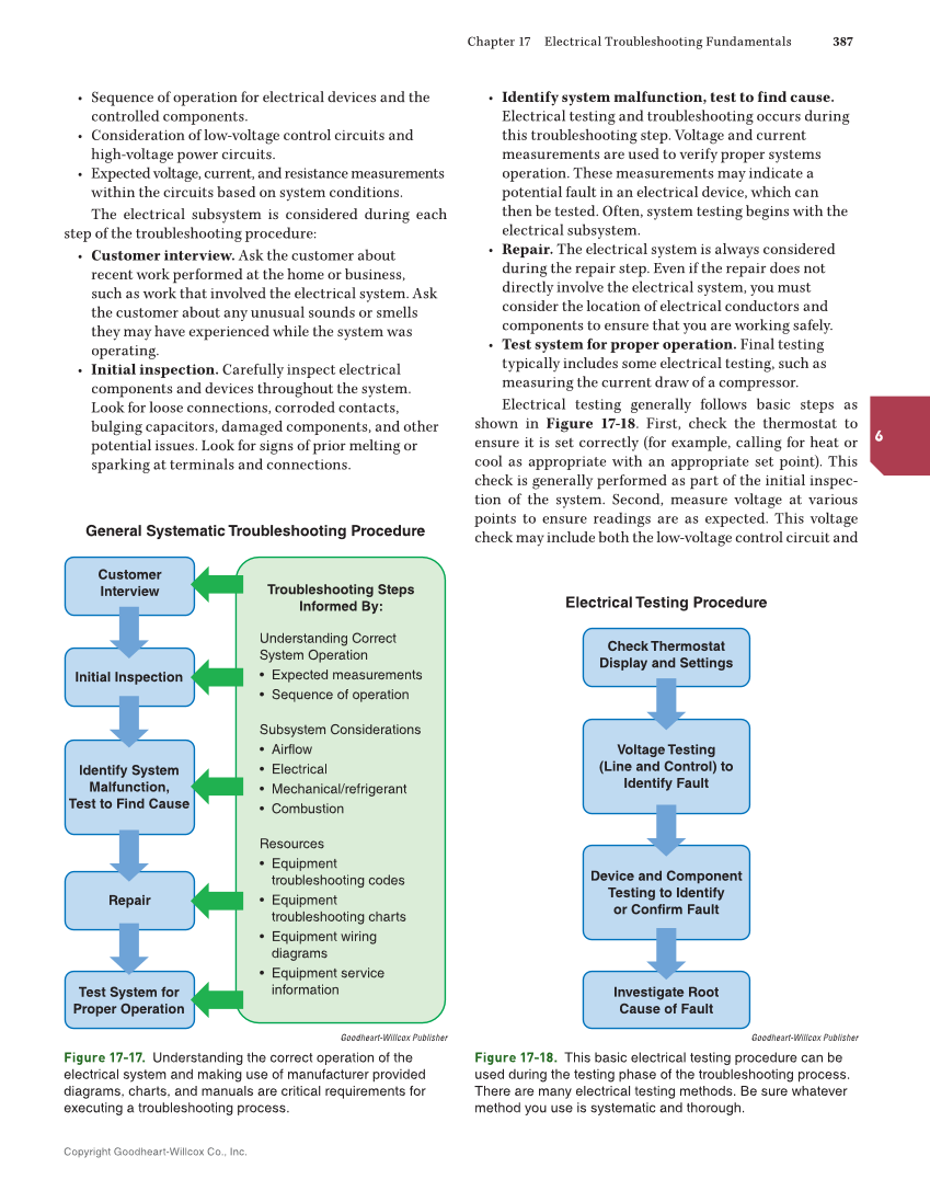 Copyright Goodheart-Willcox Co., Inc. Chapter 17 Electrical Troubleshooting Fundamentals 387 6 • Sequence of operation for electrical devices and the controlled components. • Consideration of low-voltage control circuits and high-voltage power circuits. • Expected voltage, current, and resistance measurements within the circuits based on system conditions. The electrical subsystem is considered during each step of the troubleshooting procedure: • Customer interview. Ask the customer about recent work performed at the home or business, such as work that involved the electrical system. Ask the customer about any unusual sounds or smells they may have experienced while the system was operating. • Initial inspection. Carefully inspect electrical components and devices throughout the system. Look for loose connections, corroded contacts, bulging capacitors, damaged components, and other potential issues. Look for signs of prior melting or sparking at terminals and connections. • Identify system malfunction, test to find cause. Electrical testing and troubleshooting occurs during this troubleshooting step. Voltage and current measurements are used to verify proper systems operation. These measurements may indicate a potential fault in an electrical device, which can then be tested. Often, system testing begins with the electrical subsystem. • Repair. The electrical system is always considered during the repair step. Even if the repair does not directly involve the electrical system, you must consider the location of electrical conductors and components to ensure that you are working safely. • Test system for proper operation. Final testing typically includes some electrical testing, such as measuring the current draw of a compressor. Electrical testing generally follows basic steps as shown in Figure 17-18. First, check the thermostat to ensure it is set correctly (for example, calling for heat or cool as appropriate with an appropriate set point). This check is generally performed as part of the initial inspec- tion of the system. Second, measure voltage at various points to ensure readings are as expected. This voltage check may include both the low-voltage control circuit and Understanding Correct System Operation • Expected measurements • Sequence of operation Subsystem Considerations • Airflow • Electrical • Mechanical/refrigerant • Combustion Resources • Equipment troubleshooting codes • Equipment troubleshooting charts • Equipment wiring diagrams • Equipment service information General Systematic Troubleshooting Procedure Customer Interview Initial Inspection Identify System Malfunction, Test to Find Cause Repair Test System for Proper Operation Troubleshooting Steps Informed By: Goodheart-Willcox Publisher Figure 17-17. Understanding the correct operation of the electrical system and making use of manufacturer provided diagrams, charts, and manuals are critical requirements for executing a troubleshooting process. Device and Component Testing to Identify or Confirm Fault Electrical Testing Procedure Check Thermostat Display and Settings Voltage Testing (Line and Control) to Identify Fault Investigate Root Cause of Fault Goodheart-Willcox Publisher Figure 17-18. This basic electrical testing procedure can be used during the testing phase of the troubleshooting process. There are many electrical testing methods. Be sure whatever method you use is systematic and thorough.