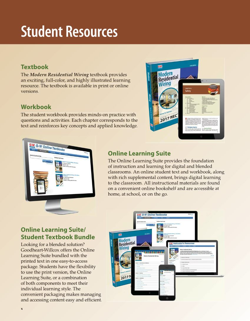 x Student Resources Textbook The Modern Residential Wiring textbook k provides g an exciting, full-color, and highly illustrated t ra learning resource. The textbook is available in n print or online versions. Workbook The student workbook k provides p minds-on practice with questions and activities. vi ti Each chapter corresponds to the text and reinforces e s key concepts and applied knowledge. Online Learning Suite The Onlin li ne Le L ea rning Suite provides the foundation of instruction s tr ti and learning for digital and blended classroom as o ms . An online student text and workbook, along a lo w wi th h rich r supplemental content, brings digital lear a rn ing to o the t classroom. All instructional materials are r e found on a convenient online bookshelf and are accessible cc at home, at school, or on the go. Online Learning Suite/ Student Textbook Bundle Looking for fo r a blended bl solution? Goodhea e ar t-W Wi llcox offers the Online Learning r ni g Suite S bundled with the printed pr in d text in one easy-to-access p pa ckage. ck Students have the flexibility to to use the print version, the Online Learning Suite, or a combination of both components to meet their individual learning style. The convenient packaging makes managi ag in g and accessing content easy and efficient. e ff