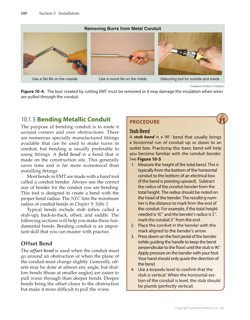 140 Section 3 Installation Copyright Goodheart-Willcox Co., Inc. PROCEDURE Stub Bend A stub bend d is a 90° d d bend that usua u al ly brings a horizonta nt al run of conduit up or o r down to an outlet box. b Practicing this basic i c bend will help you b be come familiar with the t he conduit bender. See S e Figure 10-5. 1. Measure the height t of the total bend. This is typically from the he bottom of the horizontal conduit to the he bottom of an electrical boxx (if the bend nd is pointing upward). Subtra r ac t t the radiu i us of the conduit bender from o m the th total l h he ight. The radius should be e no n ot ed on the h e head of the bender. The resulting e su lt num- ber is the distance to mark from fr om the end of the conduit. For example, e if if the t total height needed is 10″ and the e be b b en der’s radius is 5″, ″ mark the conduit 5″ 5 ″ from f ro the end. ″ 2. Place the condu d ui t t i in the bender with the mark aligned ed to t o the bender’s arrow. 3. Press down wn on o the foot pedal of the ben e nd er (while guid g ui di ng the handle to keep the th bend perpend rp n di cular to the floor) until the th stub is 90°. fl Apply A p p pl pressure on the bender er with your foot. Your Yo hand should only guide id the direction of the bend. 4. Use a torpedo level e l t to confirm that the fi stub is vertical. When W h the horizontal sec- tion of the conduit o nd is level, the stub should ho be plumb (p ( pe rfectly vertical). 10.1.3 Bending Metallic Conduit The purpose of bending conduit is to route it around corners and over obstructions. There are numerous specially manufactured fi ttings fi available that can be used to make turns in conduit, but bending is usually preferable to using fi ttings. A fi field bend fi is a bend that is made on the construction site. This generally saves time and is far more economical than installing fi ttings. fi Most bends in EMT are made with a hand tool called a conduit bender. Always use the correct size of bender for the conduit you are bending. This tool is designed to create a bend with the proper bend radius. The NEC lists the minimum radius of conduit bends in Chapter 9, Table 2. Typical bends include stub (often called a stub-up), back-to-back, offset, and saddle. The following sections will help you make these fun- damental bends. Bending conduit is an impor- tant skill that you can master with practice. Offset Bend The offset bend is used when the conduit must go around an obstruction or when the plane of the conduit must change slightly. Generally, off- sets may be done at almost any angle, but shal- low bends (those at smaller angles) are easier to pull wires through than deeper bends. Deeper bends bring the offset closer to the obstruction but make it more diffi to pull the wires. ficult Goodheart-Willcox Publisher Figure 10-4. The burr created by cutting EMT must be removed or it may damage the insulation when wires are pulled through the conduit. Removing Burrs from Metal Conduit Use a flat file on the outside Use a round file on the inside Deburring tool for outside and inside