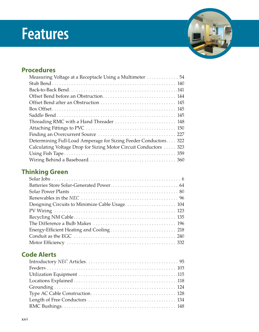 Features Procedures Measuring Voltage at a Receptacle Using a Multimeter . . . . . . . . . . . . . 54 Stub Bend . . . . . . . . . . . . . . . . . . . . . . . . . . . . . . . . . . . . . . . . . . . . . . . . . . . 140 Back-to-Back Bend. . . . . . . . . . . . . . . . . . . . . . . . . . . . . . . . . . . . . . . . . . . . .141 Offset Bend before an Obstruction. . . . . . . . . . . . . . . . . . . . . . . . . . . . . . 144 Offset Bend after an Obstruction . . . . . . . . . . . . . . . . . . . . . . . . . . . . . . . 145 Box Offset. . . . . . . . . . . . . . . . . . . . . . . . . . . . . . . . . . . . . . . . . . . . . . . . . . . 145 Saddle Bend . . . . . . . . . . . . . . . . . . . . . . . . . . . . . . . . . . . . . . . . . . . . . . . . . 145 Threading RMC with a Hand Threader . . . . . . . . . . . . . . . . . . . . . . . . . 148 Attaching Fittings to PVC . . . . . . . . . . . . . . . . . . . . . . . . . . . . . . . . . . . . . 150 Finding an Overcurrent Source . . . . . . . . . . . . . . . . . . . . . . . . . . . . . . . . 227 Determining Full-Load Amperage for Sizing Feeder Conductors. . . . 322 Calculating Voltage Drop for Sizing Motor Circuit Conductors . . . . . 323 Using Fish Tape . . . . . . . . . . . . . . . . . . . . . . . . . . . . . . . . . . . . . . . . . . . . . . 359 Wiring Behind a Baseboard. . . . . . . . . . . . . . . . . . . . . . . . . . . . . . . . . . . . 360 Thinking Green Solar Jobs . . . . . . . . . . . . . . . . . . . . . . . . . . . . . . . . . . . . . . . . . . . . . . . . . . . . . 6 Batteries Store Solar-Generated Power. . . . . . . . . . . . . . . . . . . . . . . . . . . . 64 Solar Power Plants . . . . . . . . . . . . . . . . . . . . . . . . . . . . . . . . . . . . . . . . . . . . 80 Renewables in the NEC . . . . . . . . . . . . . . . . . . . . . . . . . . . . . . . . . . . . . . . . 96 Designing Circuits to Minimize Cable Usage. . . . . . . . . . . . . . . . . . . . . 104 PV Wiring . . . . . . . . . . . . . . . . . . . . . . . . . . . . . . . . . . . . . . . . . . . . . . . . . . 123 Recycling NM Cable. . . . . . . . . . . . . . . . . . . . . . . . . . . . . . . . . . . . . . . . . . 135 The Difference a Bulb Makes . . . . . . . . . . . . . . . . . . . . . . . . . . . . . . . . . . 196 Energy-Effi Heating and Cooling. . . . . . . . . . . . . . . . . . . . . . . . . . . 218 ficient Conduit as the EGC . . . . . . . . . . . . . . . . . . . . . . . . . . . . . . . . . . . . . . . . . . 240 Motor Effi . . . . . . . . . . . . . . . . . . . . . . . . . . . . . . . . . . . . . . . . . . . . . 332 ficiency Code Alerts Introductory NEC Articles. . . . . . . . . . . . . . . . . . . . . . . . . . . . . . . . . . . . . . 95 Feeders . . . . . . . . . . . . . . . . . . . . . . . . . . . . . . . . . . . . . . . . . . . . . . . . . . . . . 103 Utilization Equipment . . . . . . . . . . . . . . . . . . . . . . . . . . . . . . . . . . . . . . . . .115 Locations Explained . . . . . . . . . . . . . . . . . . . . . . . . . . . . . . . . . . . . . . . . . . .118 Grounding . . . . . . . . . . . . . . . . . . . . . . . . . . . . . . . . . . . . . . . . . . . . . . . . . . 124 Type AC Cable Construction. . . . . . . . . . . . . . . . . . . . . . . . . . . . . . . . . . . 128 Length of Free Conductors . . . . . . . . . . . . . . . . . . . . . . . . . . . . . . . . . . . . 134 RMC Bushings. . . . . . . . . . . . . . . . . . . . . . . . . . . . . . . . . . . . . . . . . . . . . . . 148 xvi
