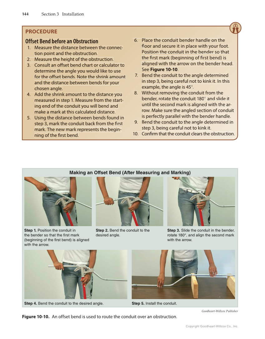 144 Section 3 Installation Copyright Goodheart-Willcox Co., Inc. Goodheart-Willcox Publisher Figure 10-10. An offset bend is used to route the conduit over an obstruction. PROCEDURE Offset Bend before an Obstruction 1. Measure the distance between the conn n n ne c- tion point and the obstruction. 2. Measure the height of the obstruc u u ct ct ion. 3. Consult an offset bend chart or or or calculator to ff determine the angle you would wo o like to use for the offset bends. Note te e the shrink amount ff and the distance betw we we en bends for your chosen angle. 4. Add the shrink am a a m mo unt to the distance you yo measured in step st st 1. Measure from the e start- s ing end of f th t t he conduit you will bend nd and make a mark m m at this calculated distance. d is 5. Using g g t th e distance between be b en ds found in ste t ep ep 3, mark the conduit back ac from the first fi m ma rk. The new mark repr p re sents the begin- ning of the first bend. d. fi 6. Place the conduit nd bender handle on th t he floor and se s ec ure it in place with your ou foot. fl Position n the t conduit in the bender d so that the firs r st mark (beginning of first fi fi r bend) is fi fi aligned ig with the arrow on the th bender head. See S Figure 10-10. 7. 7 Bend the conduit to the th angle determined in step 3, being care ar ef ul not to kink it. In this example, the angle ng is 45°. 8. Without removing mo the conduit from the e bender, rotate o ta the conduit 180° and slide s li de it until the h e second mark is aligned with w it h t th e ar- row. . Make M sure the angled section io n o of conduit is s perfectly p parallel with the bend b en de r handle. 9. Bend B the conduit to the ang n gl gl e e determined in step 3, being careful not o t to to kink it. 10. Confirm that the conduit du it clears the obstruction. fi Making an Offset Bend (After Measuring and Marking) Step 1. Position the conduit in the bender so that the first mark (beginning of the first bend) is aligned with the arrow. Step 2. Bend the conduit to the desired angle. Step 3. Slide the conduit in the bender, rotate 180°, and align the second mark with the arrow. Step 4. Bend the conduit to the desired angle. Step 5. Install the conduit.