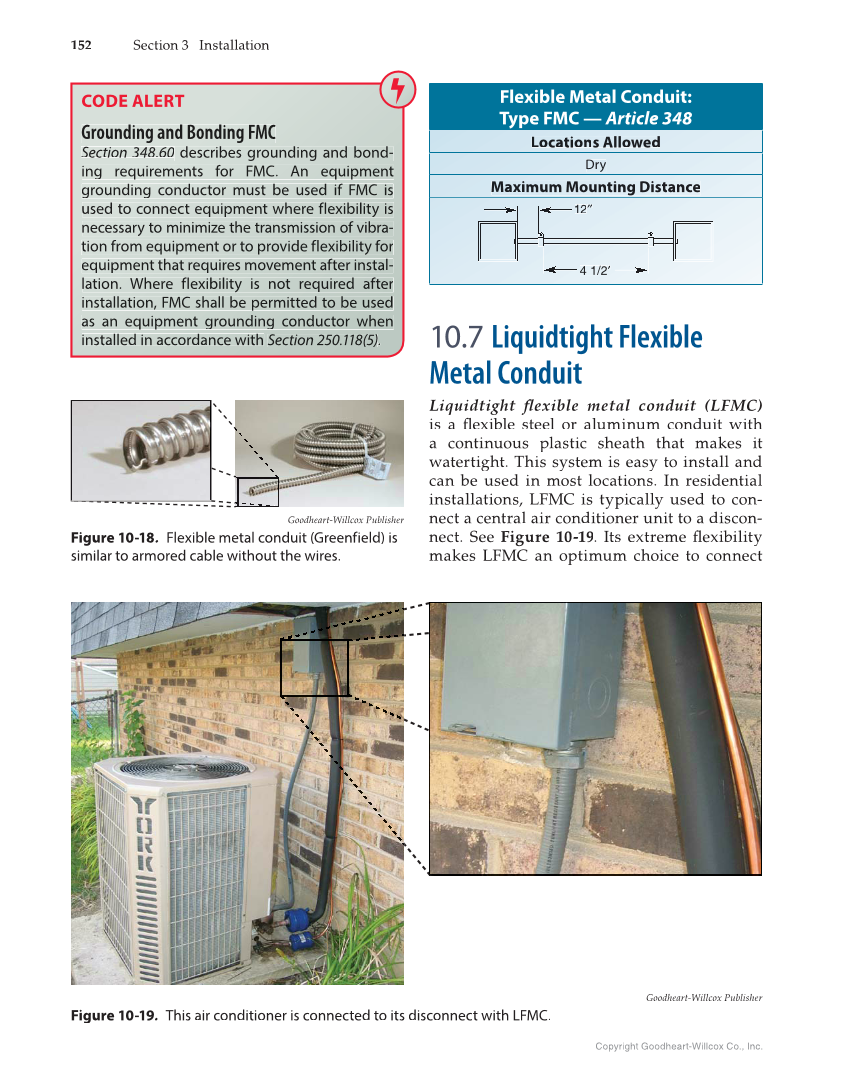 152 Section 3 Installation Copyright Goodheart-Willcox Co., Inc. Flexible Metal Conduit: Type FMC — Article 348 Locations on Allowed Dry Maximum M a x Mounting Distance 12″ 4 1/2′ Goodheart-Willcox Publisher Figure 10-19. This air conditioner is connected to its disconnect with LFMC. 10.7 Liquidtight Flexible Metal Conduit Liquidtight flexible metal conduit (LFMC) fl is a fl exible steel or aluminum conduit with fl a continuous plastic sheath that makes it watertight. This system is easy to install and can be used in most locations. In residential installations, LFMC is typically used to con- nect a central air conditioner unit to a discon- nect. See Figure 10-19. Its extreme fl exibility fl makes LFMC an optimum choice to connect Goodheart-Willcox Publisher Figure 10-18. Flexible metal conduit (Greenfield) is similar to armored cable without the wires. CODE ALERT Grounding and Bonding FMC Section 348.60 describes grounding and bond- ing requirements for FMC. An equipment grounding conductor must be used if FMC is used to connect equipment where flexibility is necessary to minimize the transmission of vibra- tion from equipment or to provide flexibility for equipment that requires movement after instal- lation. Where flexibility is not required after installation, FMC shall be permitted to be used as an equipment grounding conductor when installed in accordance with Section 250.118(5).