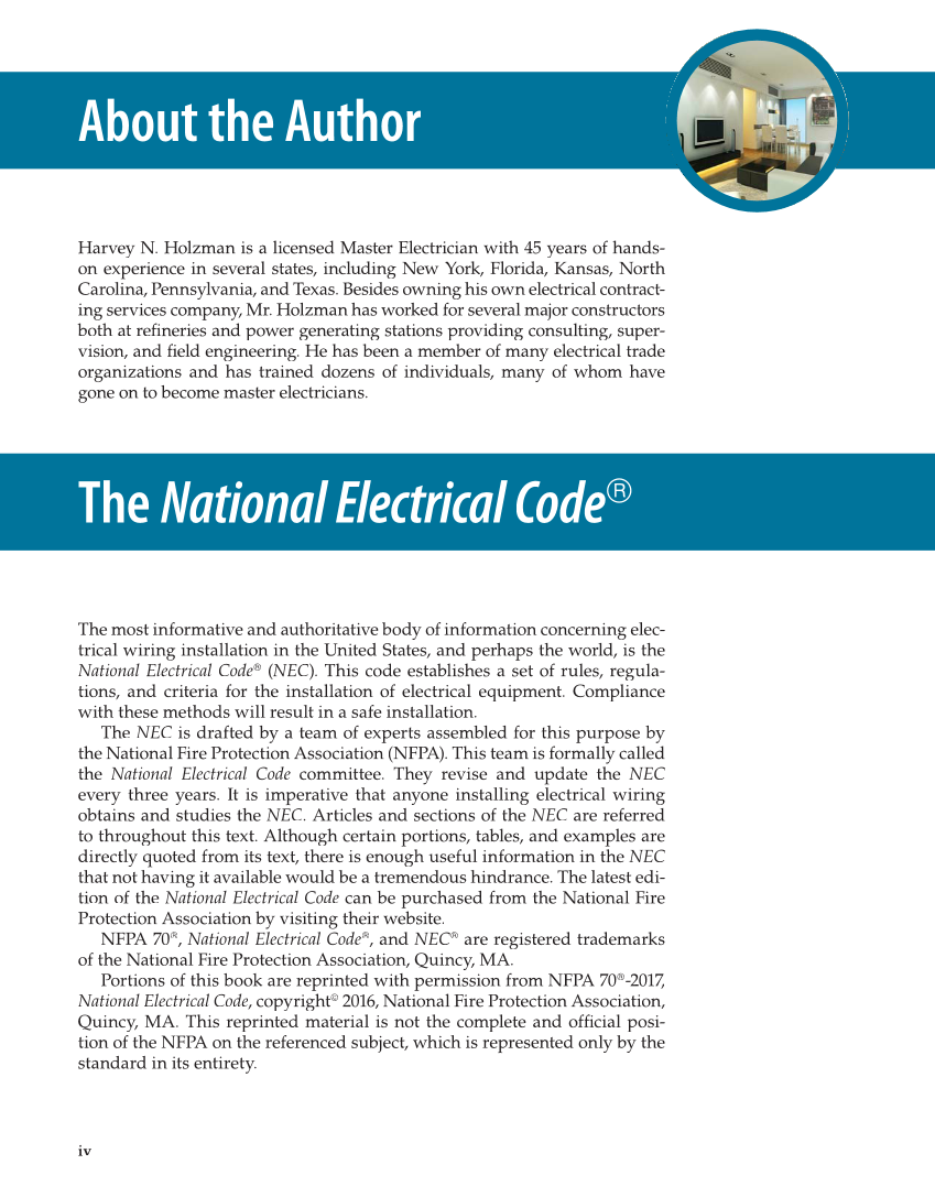 iv About the Author Harvey N. Holzman is a licensed Master Electrician with 45 years of hands- on experience in several states, including New York, Florida, Kansas, North Carolina, Pennsylvania, and Texas. Besides owning his own electrical contract- ing services company, Mr. Holzman has worked for several major constructors both at refi and power generating stations providing consulting, super- fineries vision, and fi eld engineering. He has been a member of many electrical trade fi organizations and has trained dozens of individuals, many of whom have gone on to become master electricians. The National Electrical Code® The most informative and authoritative body of information concerning elec- trical wiring installation in the United States, and perhaps the world, is the National Electrical Code® (NEC). This code establishes a set of rules, regula- tions, and criteria for the installation of electrical equipment. Compliance with these methods will result in a safe installation. The NEC is drafted by a team of experts assembled for this purpose by the National Fire Protection Association (NFPA). This team is formally called the National Electrical Code committee. They revise and update the NEC every three years. It is imperative that anyone installing electrical wiring obtains and studies the NEC. Articles and sections of the NEC are referred to throughout this text. Although certain portions, tables, and examples are directly quoted from its text, there is enough useful information in the NEC that not having it available would be a tremendous hindrance. The latest edi- tion of the National Electrical Code can be purchased from the National Fire Protection Association by visiting their website. NFPA 70®, National Electrical Code®, and NEC® are registered trademarks of the National Fire Protection Association, Quincy, MA. Portions of this book are reprinted with permission from NFPA 70®-2017, National Electrical Code, copyright© e 2016, National Fire Protection Association, Quincy, MA. This reprinted material is not the complete and official posi- fi tion of the NFPA on the referenced subject, which is represented only by the standard in its entirety.