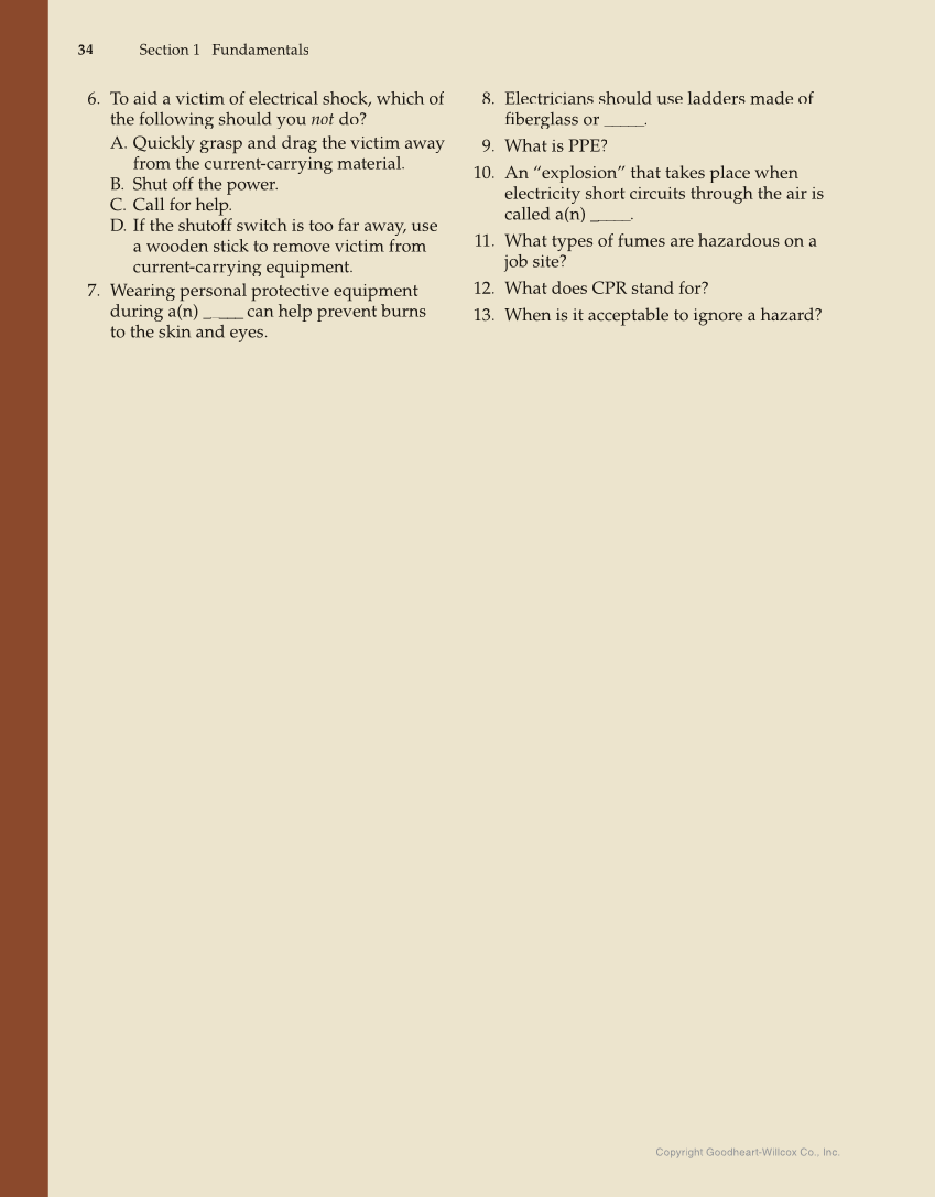 34 Section 1 Fundamentals Copyright Goodheart-Willcox Co., Inc. 6. To aid a victim of electrical shock, which of the following should you not do? A. Quickly grasp and drag the victim away from the current-carrying material. B. Shut off the power. C. Call for help. D. If the shutoff switch is too far away, use a wooden stick to remove victim from current-carrying equipment. 7. Wearing personal protective equipment during a(n) _____ _ _ can help prevent burns to the skin and eyes. 8. Electricians should use ladders made of fi berglass or fi _____. 9. What is PPE? 10. An “explosion” that takes place when electricity short circuits through the air is called a(n) _____. _ _ 11. What types of fumes are hazardous on a job site? 12. What does CPR stand for? 13. When is it acceptable to ignore a hazard?