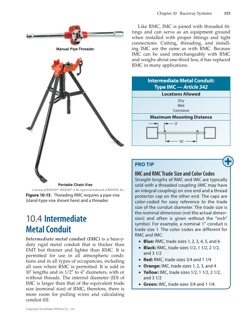 Chapter 10 Raceway Systems 153 Copyright Goodheart-Willcox Co., Inc. 10.4 Intermediate Metal Conduit Intermediate metal conduit (IMC) is a heavy- duty rigid metal conduit that is thicker than EMT but thinner and lighter than RMC. It is permitted for use in all atmospheric condi- tions and in all types of occupancies, including all uses where RMC is permitted. It is sold in 10′ lengths and in 1/2″ to 4″ diameters, with or without threads. The internal diameter (ID) of IMC is larger than that of the equivalent trade size (nominal size) of RMC therefore, there is more room for pulling wires and calculating conduit fi ll. Like RMC, IMC is joined with threaded fit- tings and can serve as an equipment ground when installed with proper fittings and tight connections. Cutting, threading, and install- ing IMC are the same as with RMC. Because IMC can be used interchangeably with RMC and weighs about one-third less, it has replaced RMC in many applications. Intermediate Metal Conduit: Type IMC — Article 342 Locations Allowed Dry Wet Corrosive Maximum Mounting Distance 3′ 10′ Courtesy of RIDGID®. RIDGID® is the registered trademark of RIDGID, Inc. Figure 10-15. Threading RMC requires a pipe vise (stand-type vise shown here) and a threader. Portable Chain Vise Manual Pipe Threader PRO TIP IMC and RMC Trade Size and Color Codes Straight lengths of RMC and IMC are typically sold with a threaded coupling (IMC may have an integral coupling) on one end and a thread protector cap on the other end. The caps are color-coded for easy reference to the trade size of the conduit diameter. The trade size is the nominal dimension (not the actual dimen- sion) and often is given without the “inch” symbol. For example, a nominal 1″ conduit is trade size 1. The color codes are different for RMC and IMC: • Blue: RMC, trade sizes 1, 2, 3, 4, 5, and 6 • Black: RMC, trade sizes 1/2, 1 1/2, 2 1/2, and 3 1/2 • Red: RMC, trade sizes 3/4 and 1 1/4 • Orange: IMC, trade sizes 1, 2, 3, and 4 • Yellow: IMC, trade sizes 1/2, 1 1/2, 2 1/2, and 3 1/2 • Green: IMC, trade sizes 3/4 and 1 1/4.
