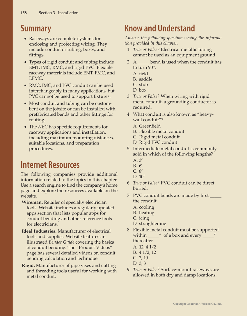 158 Section 3 Installation Copyright Goodheart-Willcox Co., Inc. Summary • Raceways are complete systems for enclosing and protecting wiring. They include conduit or tubing, boxes, and fi ttings. • Types of rigid conduit and tubing include EMT, IMC, RMC, and rigid PVC. Flexible raceway materials include ENT, FMC, and LFMC. • RMC, IMC, and PVC conduit can be used interchangeably in many applications, but PVC cannot be used to support fi xtures. • Most conduit and tubing can be custom- bent on the jobsite or can be installed with prefabricated bends and other fi ttings for routing. • The NEC has specifi c requirements for raceway applications and installation, including maximum mounting distances, suitable locations, and preparation procedures. Internet Resources The following companies provide additional information related to the topics in this chapter. Use a search engine to fi nd the company’s home page and explore the resources available on the website. Wireman. Retailer of specialty electrician tools. Website includes a regularly updated apps section that lists popular apps for conduit bending and other reference tools for electricians. Ideal Industries. Manufacturer of electrical tools and supplies. Website features an illustrated Bender Guide covering the basics of conduit bending. The “Product Videos” page has several detailed videos on conduit bending calculation and technique. Rigid. Manufacturer of pipe vises and cutting and threading tools useful for working with metal conduit. Know and Understand Answer the following questions using the informa- tion provided in this chapter. 1. True or False? Electrical metallic tubing cannot be used as an equipment ground. 2. A _____ bend is used when the conduit has to turn 90°. A. fi eld B. saddle C. stub D. box 3. True or False? When wiring with rigid metal conduit, a grounding conductor is required. 4. What conduit is also known as “heavy- wall conduit”? A. Greenfi eld B. Flexible metal conduit C. Rigid metal conduit D. Rigid PVC conduit 5. Intermediate metal conduit is commonly sold in which of the following lengths? A. 3′ B. 6′ C. 8′ D. 10′ 6. True or False? PVC conduit can be direct buried. 7. PVC conduit bends are made by fi rst _____ the conduit. A. cooling B. heating C. icing D. straightening 8. Flexible metal conduit must be supported within _____″ of a box and every _____′ thereafter. A. 12, 4 1/2 B. 4 1/2, 12 C. 3, 10 D. 3, 3 9. True or False? Surface-mount raceways are allowed in both dry and damp locations.