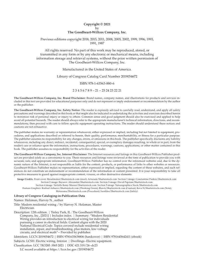Copyright © 2021 by The Goodheart-Willcox Company, Inc. Previous editions copyright 2018, 2015, 2011, 2008, 2005, 2002, 1999, 1996, 1993, 1991, 1987 All rights reserved. No part of this work may be reproduced, stored, or transmitted in any form or by any electronic or mechanical means, including information storage and retrieval systems, without the prior written permission of The Goodheart-Willcox Company, Inc. Manufactured in the United States of America. Library of Congress Catalog Card Number 2019054672 ISBN 978-1-63563-880-6 2 3 4 5 6 7 8 9 – 21 – 25 24 23 22 21 The Goodheart-Willcox Company, Inc. Brand Disclaimer: Brand names, company names, and illustrations for products and services in- cluded in this text are provided for educational purposes only and do not represent or imply endorsement or recommendation by the author or the publisher. The Goodheart-Willcox Company, Inc. Safety Notice: The reader is expressly advised to carefully read, understand, and apply all safety precautions and warnings described in this book or that might also be indicated in undertaking the activities and exercises described herein to minimize risk of personal injury or injury to others. Common sense and good judgment should also be exercised and applied to help avoid all potential hazards. The reader should always refer to the appropriate manufacturer’s technical information, directions, and recom- mendations then proceed with care to follow specific equipment operating instructions. The reader should understand these notices and cautions are not exhaustive. The publisher makes no warranty or representation whatsoever, either expressed or implied, including but not limited to equipment, pro- cedures, and applications described or referred to herein, their quality, performance, merchantability, or fitness for a particular purpose. The publisher assumes no responsibility for any changes, errors, or omissions in this book. The publisher specifically disclaims any liability whatsoever, including any direct, indirect, incidental, consequential, special, or exemplary damages resulting, in whole or in part, from the reader’s use or reliance upon the information, instructions, procedures, warnings, cautions, applications, or other matter contained in this book. The publisher assumes no responsibility for the activities of the reader. The Goodheart-Willcox Company, Inc. Internet Disclaimer: The Internet resources and listings in this Goodheart-Willcox Publisher prod- uct are provided solely as a convenience to you. These resources and listings were reviewed at the time of publication to provide you with accurate, safe, and appropriate information. Goodheart-Willcox Publisher has no control over the referenced websites and, due to the dy- namic nature of the Internet, is not responsible or liable for the content, products, or performance of links to other websites or resources. Goodheart-Willcox Publisher makes no representation, either expressed or implied, regarding the content of these websites, and such ref- erences do not constitute an endorsement or recommendation of the information or content presented. It is your responsibility to take all protective measures to guard against inappropriate content, viruses, or other destructive elements. Image Credits. Front cover: Breadmaker/Shutterstock.com (inset) Artazum/Shutterstock.com. Section 1 image: Constantine Pankin/Shutterstock.com. Section 2 image: Bayurov Alexander/Shutterstock.com. Section 3 image: David Papzian/Shutterstock.com. Section 4 image: Netfalls Remy Musser/Shutterstock.com. Section 5 image: Naturegraphica Stock/Shutterstock.com. Feature Graphics: Rashad Ashurov/Shutterstock.com (Thinking Green) Blan-k/Shutterstock.com (Caution) Rova N/Shutterstock.com (Note) Motorama/Shutterstock.com (Procedure) Sarahleo/Shutterstock.com (Safety). Library of Congress Cataloging-in-Publication Data Names: Holzman, Harvey N., author. Title: Modern residential wiring / by Harvey N. Holzman, Master Electrician. Description: 12th edition. | Tinley Park, IL : The Goodheart-Willcox Company, Inc., [2021] | Includes index. | Summary: “Modern Residential Wiring provides an introduction to electrical wiring for individuals pursuing a career in electrical fields. Content aligns with the 2020 National Electrical Code. Topics covered include residential wiring installation, repair, and troubleshooting, plus motors, low-voltage circuits, and electrical math”-- Provided by publisher. Identifiers: LCCN 2019054672 | ISBN 9781635638806 (hardcover) | ISBN 9781645642411 (ebook) Subjects: LCSH: Electric wiring, Interior. | Dwellings--Electric equipment. Classification: LCC TK3285 .H65 2021 | DDC 621.319/24--dc23 LC record available at https://lccn.loc.gov/2019054672