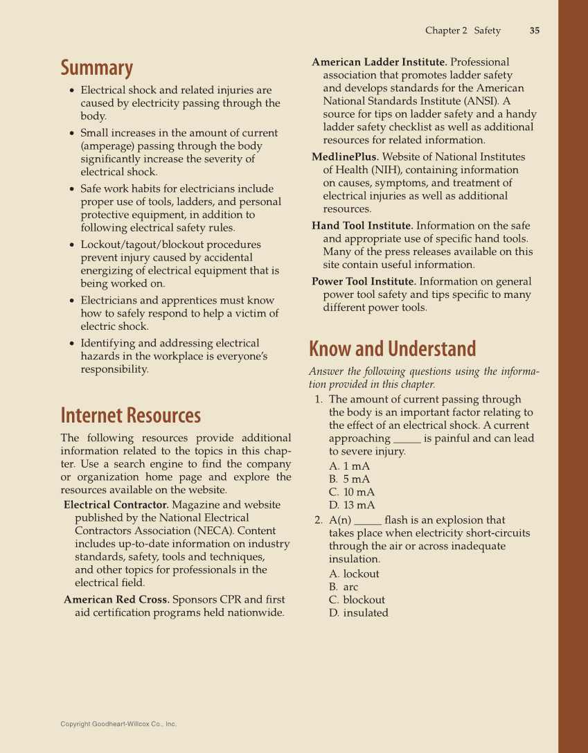 Chapter 2 Safety 35 Copyright Goodheart-Willcox Co., Inc. Summary • Electrical shock and related injuries are caused by electricity passing through the body. • Small increases in the amount of current (amperage) passing through the body signifi cantly increase the severity of electrical shock. • Safe work habits for electricians include proper use of tools, ladders, and personal protective equipment, in addition to following electrical safety rules. • Lockout/tagout/blockout procedures prevent injury caused by accidental energizing of electrical equipment that is being worked on. • Electricians and apprentices must know how to safely respond to help a victim of electric shock. • Identifying and addressing electrical hazards in the workplace is everyone’s responsibility. Internet Resources The following resources provide additional information related to the topics in this chap- ter. Use a search engine to fi nd the company or organization home page and explore the resources available on the website. Electrical Contractor. Magazine and website published by the National Electrical Contractors Association (NECA). Content includes up-to-date information on industry standards, safety, tools and techniques, and other topics for professionals in the electrical fi eld. American Red Cross. Sponsors CPR and fi rst aid certifi cation programs held nationwide. American Ladder Institute. Professional association that promotes ladder safety and develops standards for the American National Standards Institute (ANSI). A source for tips on ladder safety and a handy ladder safety checklist as well as additional resources for related information. MedlinePlus. Website of National Institutes of Health (NIH), containing information on causes, symptoms, and treatment of electrical injuries as well as additional resources. Hand Tool Institute. Information on the safe and appropriate use of specifi c hand tools. Many of the press releases available on this site contain useful information. Power Tool Institute. Information on general power tool safety and tips specifi c to many different power tools. Know and Understand Answer the following questions using the informa- tion provided in this chapter. 1. The amount of current passing through the body is an important factor relating to the effect of an electrical shock. A current approaching _____ is painful and can lead to severe injury. A. 1 mA B. 5 mA C. 10 mA D. 13 mA 2. A(n) _____ fl ash is an explosion that takes place when electricity short-circuits through the air or across inadequate insulation. A. lockout B. arc C. blockout D. insulated