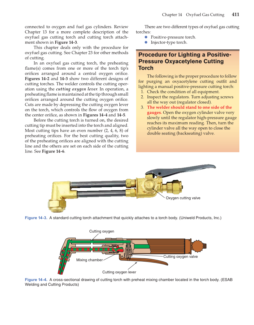 Chapter 14 Oxyfuel Gas Cutting 411 connected to oxygen and fuel gas cylinders. Review Chapter 13 for a more complete description of the oxyfuel gas cutting torch and cutting torch attach- ment shown in Figure 14-3. This chapter deals only with the procedure for oxyfuel gas cutting. See Chapter 23 for other methods of cutting. In an oxyfuel gas cutting torch, the preheating fl ame(s) comes from one or more of the torch tip’s orifi ces arranged around a central oxygen orifi ce. Figures 14-2 and 14-3 show two different designs of cutting torches. The welder controls the cutting oper- ation using the cutting oxygen lever. In operation, a preheating fl ame is maintained at the tip through small orifi ces arranged around the cutting oxygen orifi ce. Cuts are made by depressing the cutting oxygen lever on the torch, which controls the fl ow of oxygen from the center orifi ce, as shown in Figures 14-4 and 14-5. Before the cutting torch is turned on, the desired cutting tip must be inserted into the torch and aligned. Most cutting tips have an even number (2, 4, 6, 8) of preheating orifi ces. For the best cutting quality, two of the preheating orifi ces are aligned with the cutting line and the others are set on each side of the cutting line. See Figure 14-6. There are two different types of oxyfuel gas cutting torches: ● Positive-pressure torch. ● Injector-type torch. Procedure for Lighting a Positive- Pressure Oxyacetylene Cutting Torch The following is the proper procedure to follow for purging an oxyacetylene cutting outfi t and lighting a manual positive-pressure cutting torch: 1. Check the condition of all equipment. 2. Inspect the regulators. Turn adjusting screws all the way out (regulator closed). 3. The welder should stand to one side of the gauges. Open the oxygen cylinder valve very slowly until the regulator high-pressure gauge reaches its maximum reading. Then, turn the cylinder valve all the way open to close the double seating (backseating) valve. Figure 14-3. A standard cutting torch attachment that quickly attaches to a torch body. (Uniweld Products, Inc.) Oxygen cutting valve Figure 14-4. A cross-sectional drawing of cutting torch with preheat mixing chamber located in the torch body. (ESAB Welding and Cutting Products) Cutting oxygen Mixing chamber Cutting oxygen lever Cutting oxygen valve