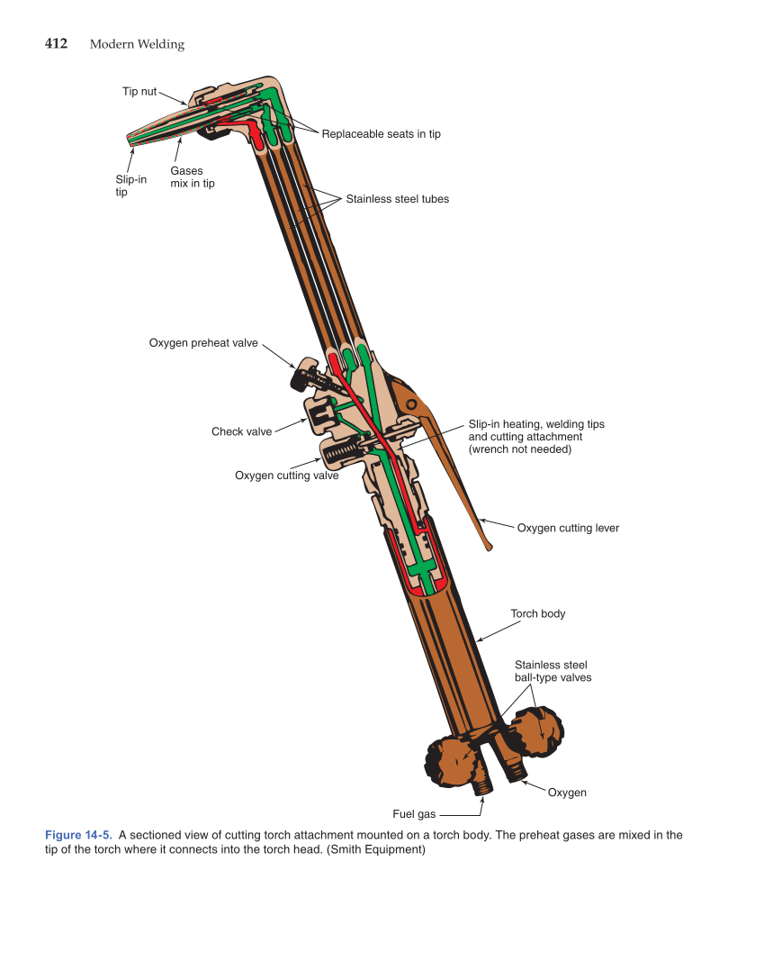 412 Modern Welding Stainless steel ball-type valves Torch body Oxygen cutting lever Slip-in heating, welding tips and cutting attachment (wrench not needed) Oxygen cutting valve Oxygen preheat valve Check valve Stainless steel tubes Replaceable seats in tip Slip-in tip Gases mix in tip Tip nut Fuel gas Oxygen Figure 14-5. A sectioned view of cutting torch attachment mounted on a torch body. The preheat gases are mixed in the tip of the torch where it connects into the torch head. (Smith Equipment)