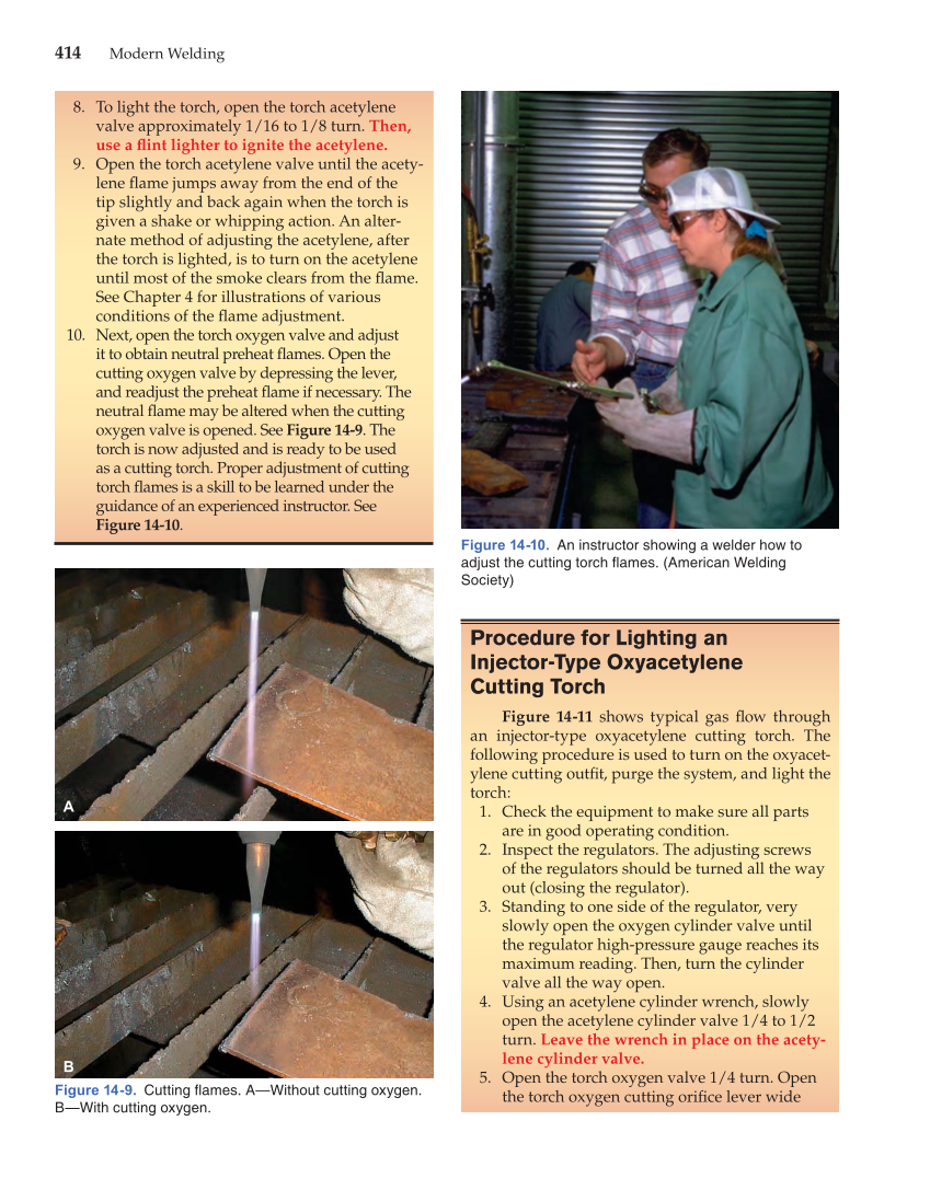 414 Modern Welding 8. To light the torch, open the torch acetylene valve approximately 1/16 to 1/8 turn. Then, use a fl int lighter to ignite the acetylene. 9. Open the torch acetylene valve until the acety- lene fl ame jumps away from the end of the tip slightly and back again when the torch is given a shake or whipping action. An alter- nate method of adjusting the acetylene, after the torch is lighted, is to turn on the acetylene until most of the smoke clears from the fl ame. See Chapter 4 for illustrations of various conditions of the fl ame adjustment. 10. Next, open the torch oxygen valve and adjust it to obtain neutral preheat fl ames. Open the cutting oxygen valve by depressing the lever, and readjust the preheat fl ame if necessary. The neutral fl ame may be altered when the cutting oxygen valve is opened. See Figure 14-9. The torch is now adjusted and is ready to be used as a cutting torch. Proper adjustment of cutting torch fl ames is a skill to be learned under the guidance of an experienced instructor. See Figure 14-10. Procedure for Lighting an Injector-Type Oxyacetylene Cutting Torch Figure 14-11 shows typical gas fl ow through an injector-type oxyacetylene cutting torch. The following procedure is used to turn on the oxyacet- ylene cutting outfi t, purge the system, and light the torch: 1. Check the equipment to make sure all parts are in good operating condition. 2. Inspect the regulators. The adjusting screws of the regulators should be turned all the way out (closing the regulator). 3. Standing to one side of the regulator, very slowly open the oxygen cylinder valve until the regulator high-pressure gauge reaches its maximum reading. Then, turn the cylinder valve all the way open. 4. Using an acetylene cylinder wrench, slowly open the acetylene cylinder valve 1/4 to 1/2 turn. Leave the wrench in place on the acety- lene cylinder valve. 5. Open the torch oxygen valve 1/4 turn. Open the torch oxygen cutting orifi ce lever wide A B Figure 14-9. Cutting fl ames. A—Without cutting oxygen. B—With cutting oxygen. Figure 14-10. An instructor showing a welder how to adjust the cutting torch fl ames. (American Welding Society)