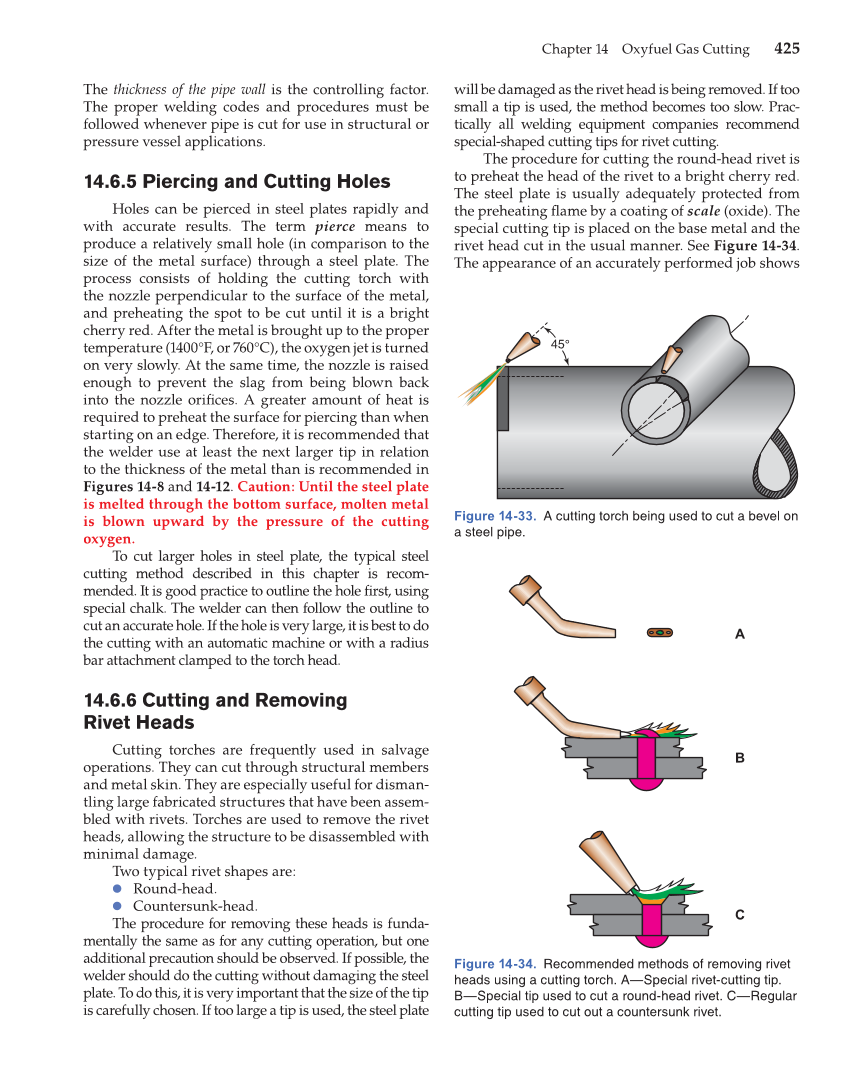 Chapter 14 Oxyfuel Gas Cutting 425 The thickness of the pipe wall is the controlling factor. The proper welding codes and procedures must be followed whenever pipe is cut for use in structural or pressure vessel applications. 14.6.5 Piercing and Cutting Holes Holes can be pierced in steel plates rapidly and with accurate results. The term pierce means to produce a relatively small hole (in comparison to the size of the metal surface) through a steel plate. The process consists of holding the cutting torch with the nozzle perpendicular to the surface of the metal, and preheating the spot to be cut until it is a bright cherry red. After the metal is brought up to the proper temperature (1400°F, or 760°C), the oxygen jet is turned on very slowly. At the same time, the nozzle is raised enough to prevent the slag from being blown back into the nozzle orifi ces. A greater amount of heat is required to preheat the surface for piercing than when starting on an edge. Therefore, it is recommended that the welder use at least the next larger tip in relation to the thickness of the metal than is recommended in Figures 14-8 and 14-12. Caution: Until the steel plate is melted through the bottom surface, molten metal is blown upward by the pressure of the cutting oxygen. To cut larger holes in steel plate, the typical steel cutting method described in this chapter is recom- mended. It is good practice to outline the hole fi rst, using special chalk. The welder can then follow the outline to cut an accurate hole. If the hole is very large, it is best to do the cutting with an automatic machine or with a radius bar attachment clamped to the torch head. 14.6.6 Cutting and Removing Rivet Heads Cutting torches are frequently used in salvage operations. They can cut through structural members and metal skin. They are especially useful for disman- tling large fabricated structures that have been assem- bled with rivets. Torches are used to remove the rivet heads, allowing the structure to be disassembled with minimal damage. Two typical rivet shapes are: ● Round-head. ● Countersunk-head. The procedure for removing these heads is funda- mentally the same as for any cutting operation, but one additional precaution should be observed. If possible, the welder should do the cutting without damaging the steel plate. To do this, it is very important that the size of the tip is carefully chosen. If too large a tip is used, the steel plate will be damaged as the rivet head is being removed. If too small a tip is used, the method becomes too slow. Prac- tically all welding equipment companies recommend special-shaped cutting tips for rivet cutting. The procedure for cutting the round-head rivet is to preheat the head of the rivet to a bright cherry red. The steel plate is usually adequately protected from the preheating fl ame by a coating of scale (oxide). The special cutting tip is placed on the base metal and the rivet head cut in the usual manner. See Figure 14-34. The appearance of an accurately performed job shows Figure 14-33. A cutting torch being used to cut a bevel on a steel pipe. 45° Figure 14-34. Recommended methods of removing rivet heads using a cutting torch. A—Special rivet-cutting tip. B—Special tip used to cut a round-head rivet. C—Regular cutting tip used to cut out a countersunk rivet. A B C