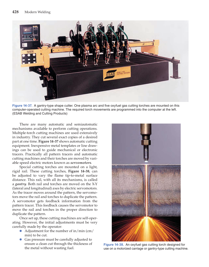 428 Modern Welding There are many automatic and semiautomatic mechanisms available to perform cutting operations. Multiple-torch cutting machines are used extensively in industry. They cut several exact copies of a desired part at one time. Figure 14-37 shows automatic cutting equipment. Inexpensive metal templates or line draw- ings can be used to guide mechanical or electronic tracers. Practically all pattern tracers and automatic cutting machines and their torches are moved by vari- able speed electric motors known as servomotors. Special cutting torches are mounted on a light, rigid rail. These cutting torches, Figure 14-38, can be adjusted to vary the fl ame tip-to-metal surface distance. This rail, with all its mechanisms, is called a gantry. Both rail and torches are moved on the X-Y (lateral and longitudinal) axes by electric servomotors. As the tracer moves around the pattern, the servomo- tors move the rail and torches to duplicate the pattern. A servomotor gets feedback information from the pattern tracer. This feedback causes the servomotor to move the rail and torches in the proper direction to duplicate the pattern. Once set up, these cutting machines are self-oper- ating. However, the initial adjustments must be very carefully made by the operator: ● Adjustment for the number of in/min (cm/ min) to be cut. ● Gas pressure must be carefully adjusted to ensure a clean cut through the thickness of the metal without wasting fuel. Figure 14-38. An oxyfuel gas cutting torch designed for use on a motorized carriage or gantry-type cutting machine. Figure 14-37. A gantry-type shape cutter. One plasma arc and fi ve oxyfuel gas cutting torches are mounted on this computer-operated cutting machine. The required torch movements are programmed into the computer at the left. (ESAB Welding and Cutting Products)