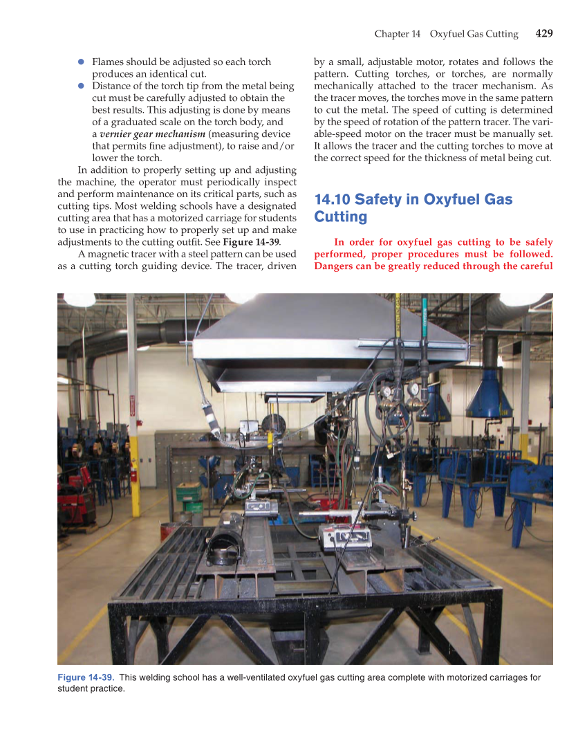 Chapter 14 Oxyfuel Gas Cutting 429 ● Flames should be adjusted so each torch produces an identical cut. ● Distance of the torch tip from the metal being cut must be carefully adjusted to obtain the best results. This adjusting is done by means of a graduated scale on the torch body, and a vernier gear mechanism (measuring device that permits fi ne adjustment), to raise and/or lower the torch. In addition to properly setting up and adjusting the machine, the operator must periodically inspect and perform maintenance on its critical parts, such as cutting tips. Most welding schools have a designated cutting area that has a motorized carriage for students to use in practicing how to properly set up and make adjustments to the cutting outfi t. See Figure 14-39. A magnetic tracer with a steel pattern can be used as a cutting torch guiding device. The tracer, driven by a small, adjustable motor, rotates and follows the pattern. Cutting torches, or torches, are normally mechanically attached to the tracer mechanism. As the tracer moves, the torches move in the same pattern to cut the metal. The speed of cutting is determined by the speed of rotation of the pattern tracer. The vari- able-speed motor on the tracer must be manually set. It allows the tracer and the cutting torches to move at the correct speed for the thickness of metal being cut. 14.10 Safety in Oxyfuel Gas Cutting In order for oxyfuel gas cutting to be safely performed, proper procedures must be followed. Dangers can be greatly reduced through the careful Figure 14-39. This welding school has a well-ventilated oxyfuel gas cutting area complete with motorized carriages for student practice.