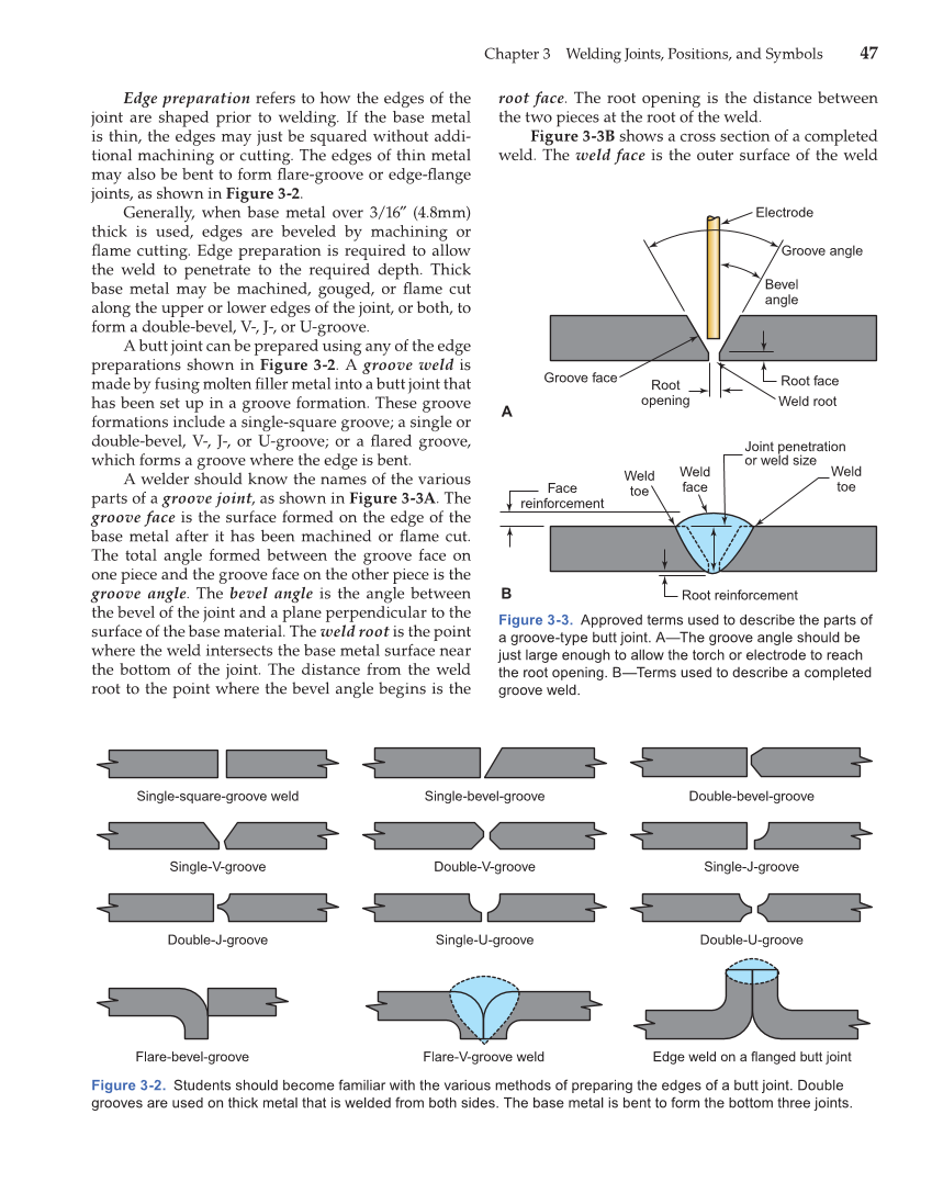 Chapter 3 Welding Joints, Positions, and Symbols 47 Edge preparation refers to how the edges of the joint are shaped prior to welding. If the base metal is thin, the edges may just be squared without addi- tional machining or cutting. The edges of thin metal may also be bent to form fl are-groove or edge-fl ange joints, as shown in Figure 3-2. Generally, when base metal over 3/16″ (4.8mm) thick is used, edges are beveled by machining or fl ame cutting. Edge preparation is required to allow the weld to penetrate to the required depth. Thick base metal may be machined, gouged, or fl ame cut along the upper or lower edges of the joint, or both, to form a double-bevel, V-, J-, or U-groove. A butt joint can be prepared using any of the edge preparations shown in Figure 3-2. A groove weld is made by fusing molten fi ller metal into a butt joint that has been set up in a groove formation. These groove formations include a single-square groove a single or double-bevel, V-, J-, or U-groove or a fl ared groove, which forms a groove where the edge is bent. A welder should know the names of the various parts of a groove joint, as shown in Figure 3-3A. The groove face is the surface formed on the edge of the base metal after it has been machined or fl ame cut. The total angle formed between the groove face on one piece and the groove face on the other piece is the groove angle. The bevel angle is the angle between the bevel of the joint and a plane perpendicular to the surface of the base material. The weld root is the point where the weld intersects the base metal surface near the bottom of the joint. The distance from the weld root to the point where the bevel angle begins is the root face. The root opening is the distance between the two pieces at the root of the weld. Figure 3-3B shows a cross section of a completed weld. The weld face is the outer surface of the weld Figure 3-2. Students should become familiar with the various methods of preparing the edges of a butt joint. Double grooves are used on thick metal that is welded from both sides. The base metal is bent to form the bottom three joints. Single-square-groove weld Single-V-groove Double-J-groove Flare-bevel-groove Flare-V-groove weld Edge weld on a flanged butt joint Double-U-groove Single-U-groove Single-J-groove Double-V-groove Single-bevel-groove Double-bevel-groove Figure 3-3. Approved terms used to describe the parts of a groove-type butt joint. A—The groove angle should be just large enough to allow the torch or electrode to reach the root opening. B—Terms used to describe a completed groove weld. Electrode Groove angle Bevel angle Root face Weld root Root opening Face reinforcement Root reinforcement Weld face Weld toe Weld toe A B Groove face Joint penetration or weld size