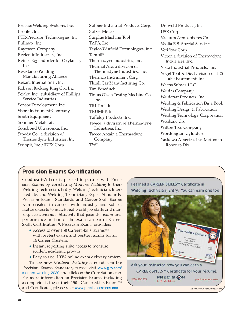 vi Process Welding Systems, Inc. Profi ler, Inc. PTR-Precision Technologies, Inc. Pullmax, Inc. Raytheon Company Reelcraft Industries, Inc. Reiner Eggendorfer for Oxylance, Inc. Resistance Welding Manufacturing Alliance Rexarc International, Inc. Robvon Backing Ring Co., Inc. Sciaky, Inc., subsidiary of Phillips Service Industries Sensor Development, Inc. Shore Instrument Company Smith Equipment Sommer Metalcraft Sonobond Ultrasonics, Inc. Stoody Co., a division of Thermadyne Industries, Inc. Strippit, Inc./IDEX Corp. Suhner Industrial Products Corp. Sulzer Metco Surplus Machine Tool TAFA, Inc. Taylor-Winfi eld Technologies, Inc. Tempil® Thermadyne Industries, Inc. Thermal Arc, a division of Thermadyne Industries, Inc. Thermco Instrument Corp. Thrall Car Manufacturing Co. Tim Bowditch Tinius Olsen Testing Machine Co., Inc. TRI-Tool, Inc. TRUMPF, Inc. Tuffaloy Products, Inc. Tweco, a division of Thermadyne Industries, Inc. Tweco Arcair, a Thermadyne Company TWI Uniweld Products, Inc. USX Corp. Vacuum Atmospheres Co. Veolia E.S. Special Services Verifl ow Corp. Victor, a division of Thermadyne Industries, Inc. Vista Industrial Products, Inc. Vogel Tool & Die, Division of TES Tube Equipment, Inc. Wachs Subsea LLC Weldas Company Weldcraft Products, Inc. Welding & Fabrication Data Book Welding Design & Fabrication Welding Technology Corporation Weldsale Co. Wilton Tool Company Worthington Cylinders Yaskawa America, Inc. Motoman Robotics Div. Precision Exams Certification Goodheart-Willcox is pleased to partner with Preci- sion Exams by correlating Modern Welding to their Welding Technician, Entry Welding Technician, Inter- mediate and Welding Technician, Expert Standards. Precision Exams Standards and Career Skill Exams were created in concert with industry and subject matter experts to match real-world job skills and mar- ketplace demands. Students that pass the exam and performance portion of the exam can earn a Career Skills Certifi cation™. Precision Exams provides: • Access to over 150 Career Skills Exams™ with pretest exams and posttest exams for all 16 Career Clusters. • Instant reporting suite access to measure student academic growth. • Easy-to-use, 100% online exam delivery system. To see how Modern Welding correlates to the Precision Exams Standards, please visit www.g-w.com/ modern-welding-2020 and click on the Correlations tab. For more information on Precision Exams, including a complete listing of their 150+ Career Skills Exams™ and Certifi cates, please visit www.precisionexams.com. Wavebreakmedia/istock.com