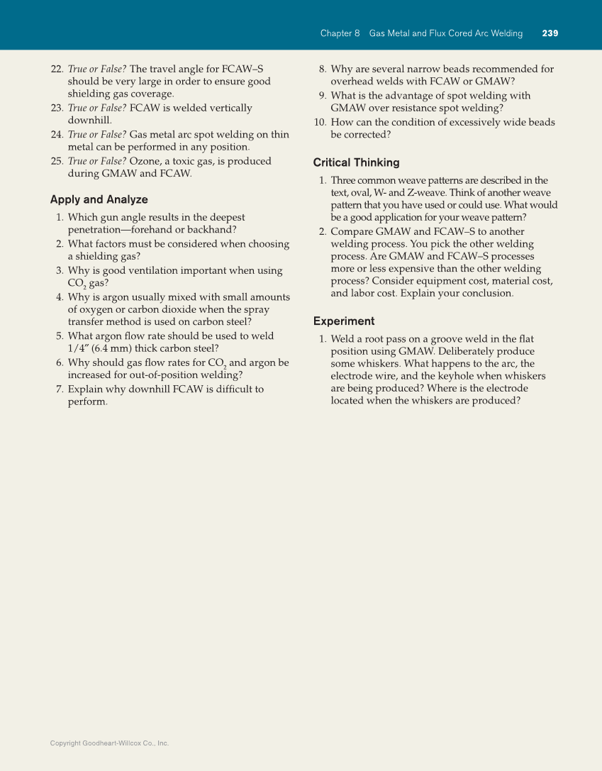 Copyright Goodheart-Willcox Co., Inc. Chapter 8 Gas Metal and Flux Cored Arc Welding 239 22. True or False? The travel angle for FCAW–S should be very large in order to ensure good shielding gas coverage. 23. True or False? FCAW is welded vertically downhill. 24. True or False? Gas metal arc spot welding on thin metal can be performed in any position. 25. True or False? Ozone, a toxic gas, is produced during GMAW and FCAW. Apply and Analyze 1. Which gun angle results in the deepest penetration—forehand or backhand? 2. What factors must be considered when choosing a shielding gas? 3. Why is good ventilation important when using CO 2 gas? 4. Why is argon usually mixed with small amounts of oxygen or carbon dioxide when the spray transfer method is used on carbon steel? 5. What argon fl ow rate should be used to weld 1/4″ (6.4 mm) thick carbon steel? 6. Why should gas fl ow rates for CO 2 and argon be increased for out-of-position welding? 7. Explain why downhill FCAW is diffi cult to perform. 8. Why are several narrow beads recommended for overhead welds with FCAW or GMAW? 9. What is the advantage of spot welding with GMAW over resistance spot welding? 10. How can the condition of excessively wide beads be corrected? Critical Thinking 1. Three common weave patterns are described in the text, oval, W- and Z-weave. Think of another weave pattern that you have used or could use. What would be a good application for your weave pattern? 2. Compare GMAW and FCAW–S to another welding process. You pick the other welding process. Are GMAW and FCAW–S processes more or less expensive than the other welding process? Consider equipment cost, material cost, and labor cost. Explain your conclusion. Experiment 1. Weld a root pass on a groove weld in the fl at position using GMAW. Deliberately produce some whiskers. What happens to the arc, the electrode wire, and the keyhole when whiskers are being produced? Where is the electrode located when the whiskers are produced?
